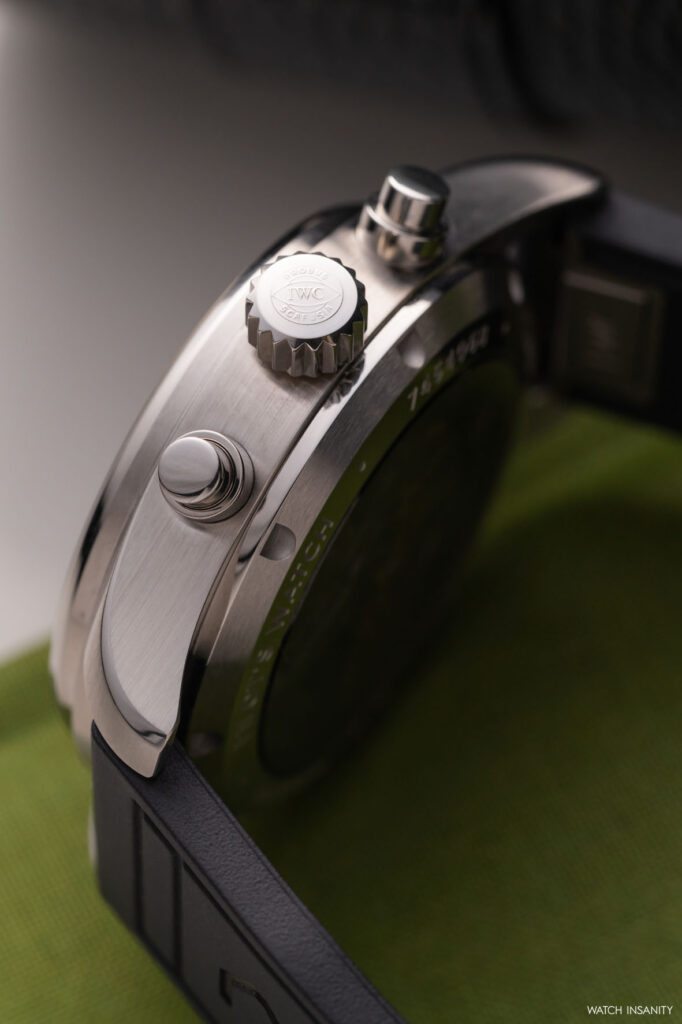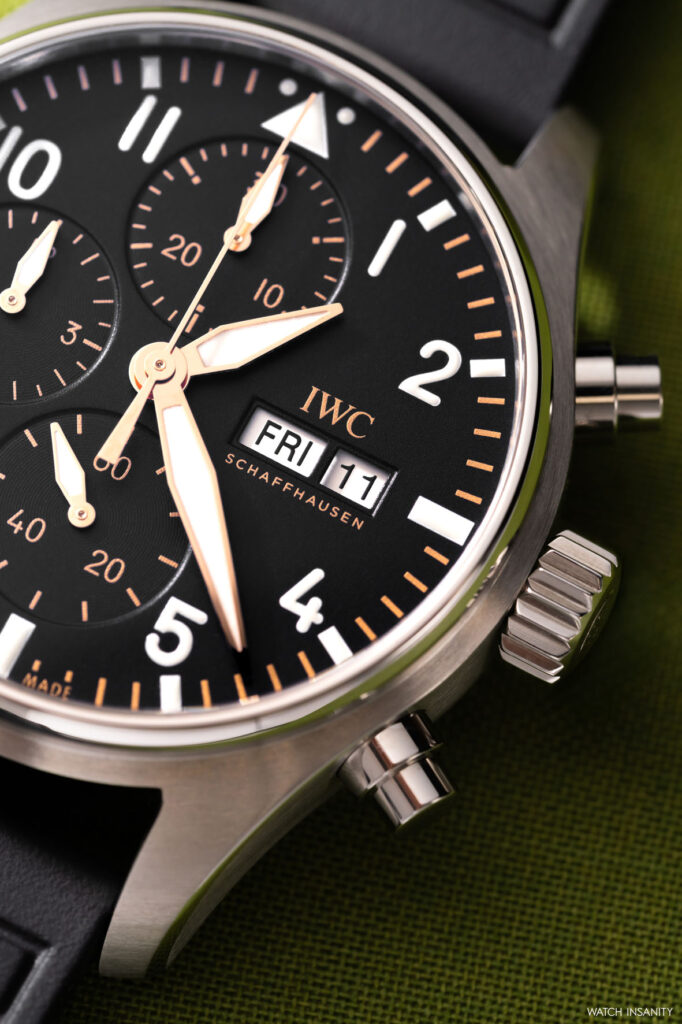 Gold is used generously for all the counter indices and the dial’s minute track, as well as for the outline of all the hands and the chronograph seconds hand. It also appears on the IWC SCHAFFHAUSEN lettering, which, in keeping with the brand’s Pilot’s Watch tradition, accompanies the two date windows.