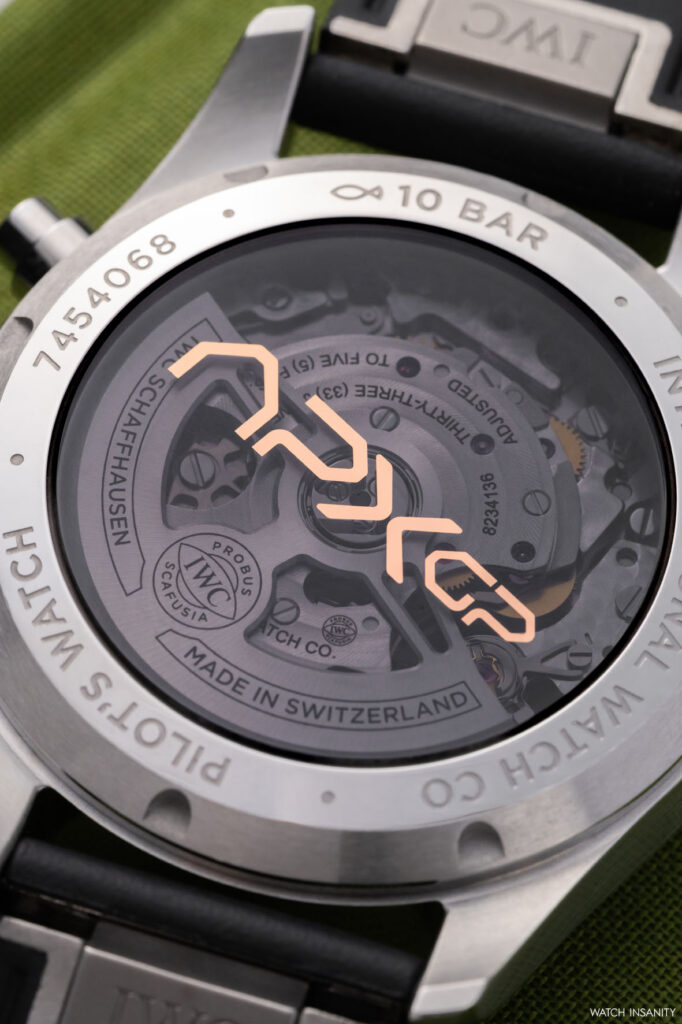 For the Pilot‘s Watch Chronograph 41 APXGP, IWC has chosen to rely on the in-house calibre 69385 introduced in the 41 mm case references. As mentioned, this is an automatic movement developed directly by the brand based on another of its own calibres, the 69370. It is a robust and reliable chronograph calibre with a column wheel that equips virtually all watches in the collection with a 41 mm case.
