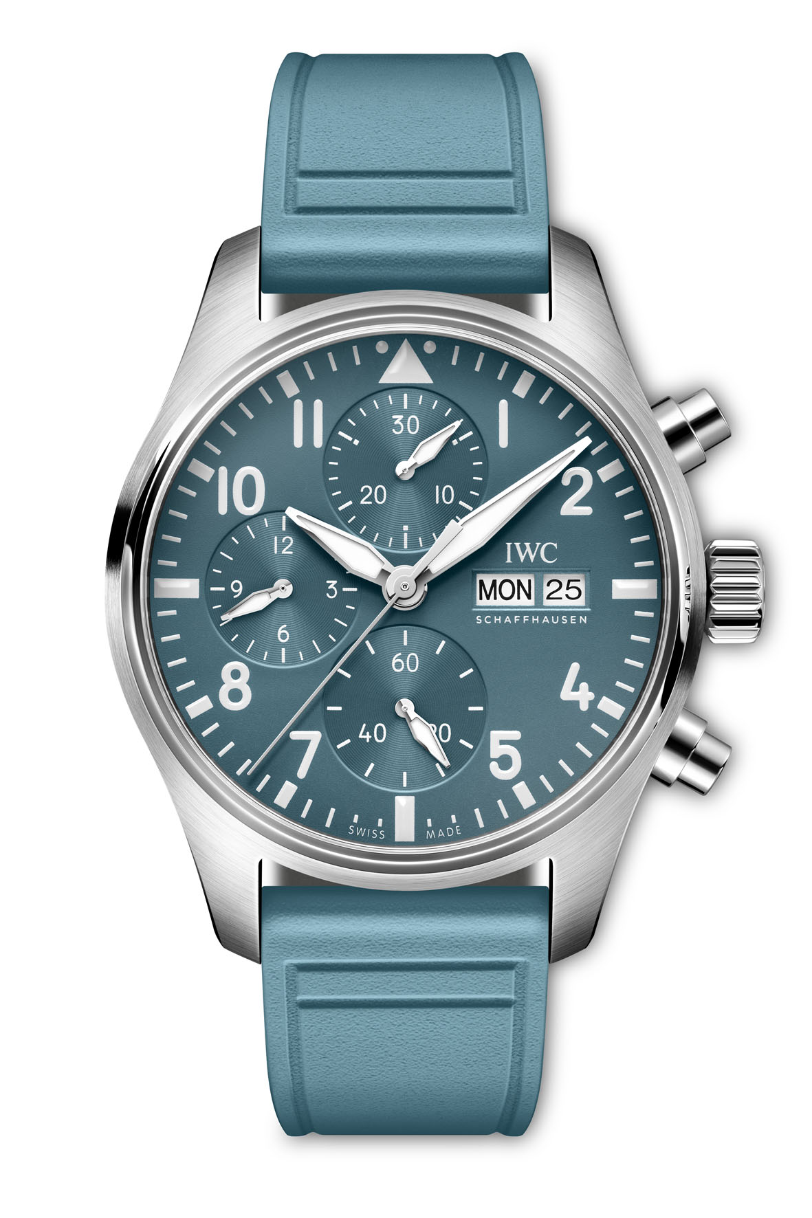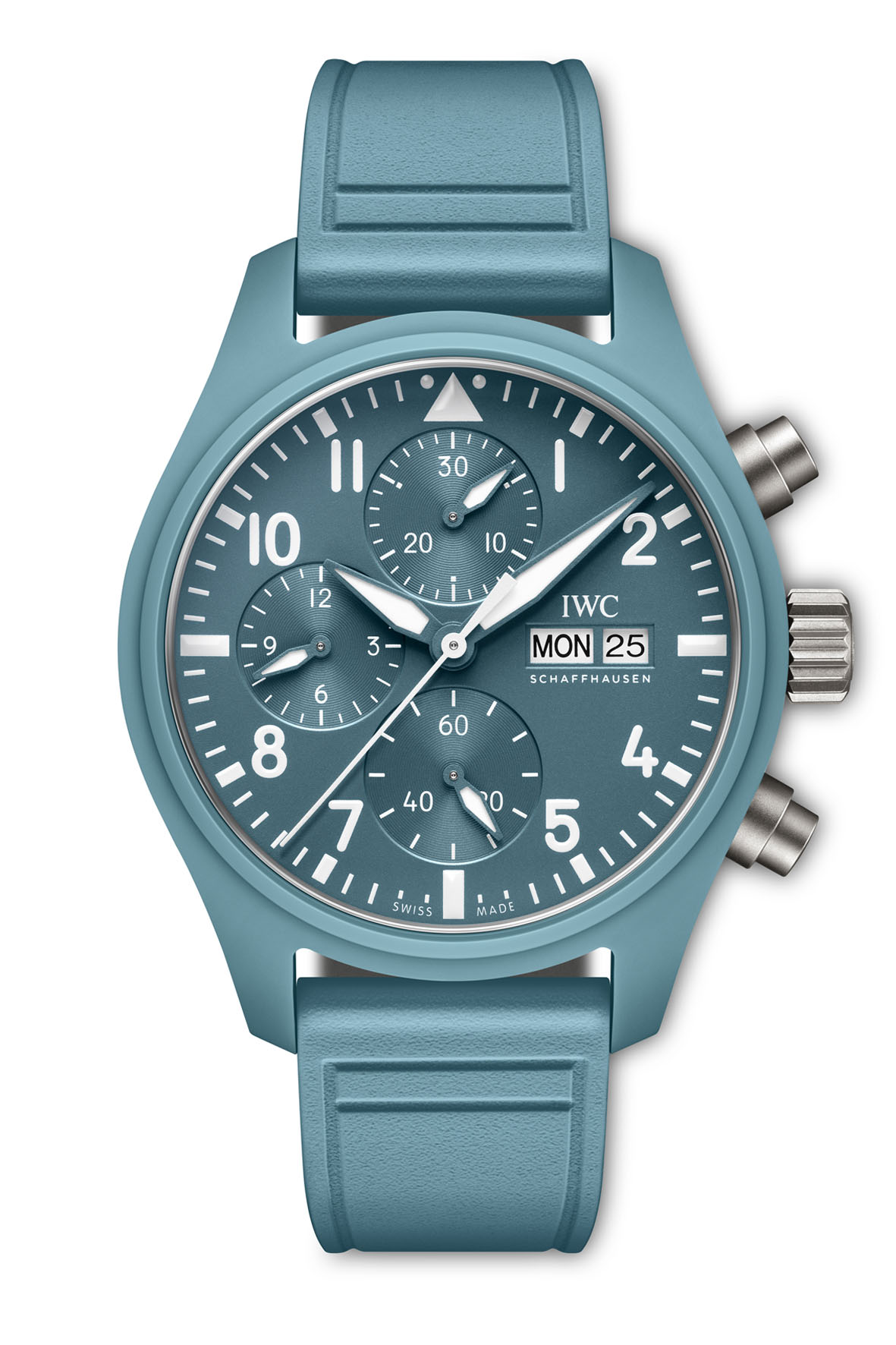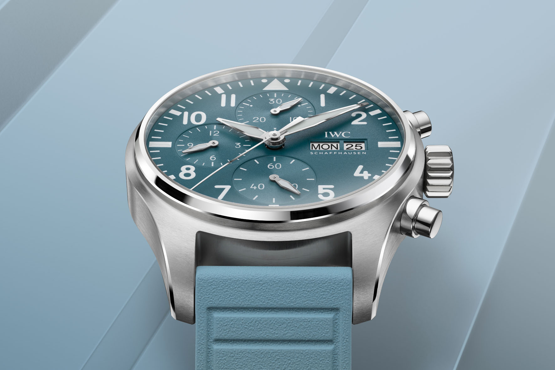 21 July 2025With the new Pilot’s Watch Chronograph 41 TOP GUN Miramar, IWC adds a new ceramic color to its Colors of TOP GUN collection. The watch features a ceramic case in a new color named TOP GUN Miramar, a light blue shade developed by IWC and Pantone, inspired by the light blue T-shirts worn under their flight suits by TOP GUN instructors. The case is paired with a matching dial and rubber strap in the same hue. The brand also presents a new version of the Pilot’s Watch Chronograph 41 in stainless steel with a TOP GUN Miramar-colored dial and rubber strap.
