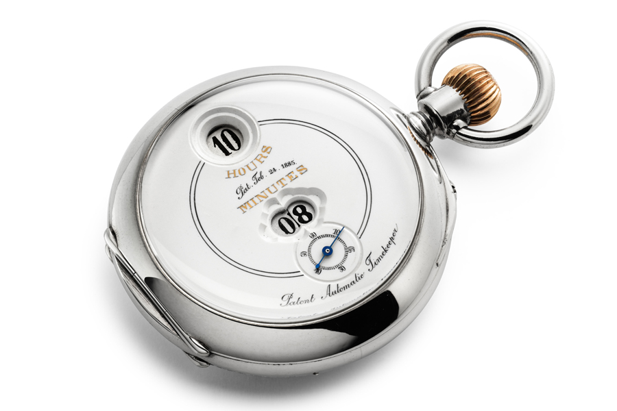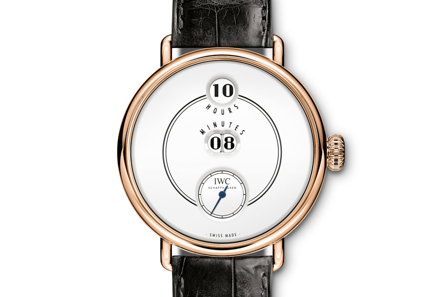 The timepiece shows hours and minutes in large numerals on rotating discs, and is inspired by the pocket watches that IWC produced in 1884. The IWC Tribute to Pallweber Edition «150 Years» has a 18-carat red gold 45mm case, white dial with lacquered finish, white display discs, and a blued seconds hand. The watch is available in a limited edition of 250 pieces. As a reference to the design of the historic Pallweber watches and a tribute to F. A. Jones – the American watchmaker who founded IWC – the windows of the digital display are labelled “Hours” and “Minutes”.