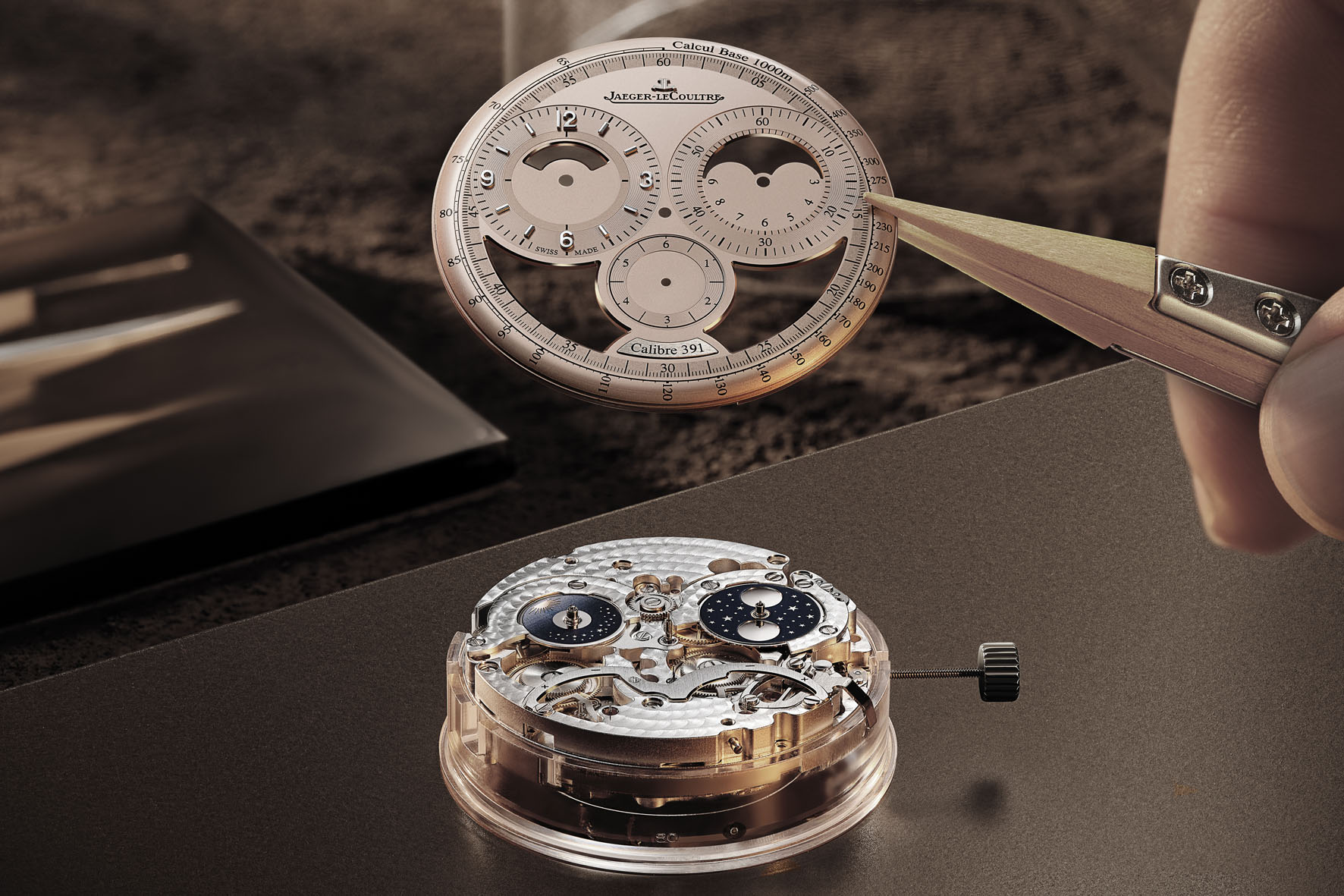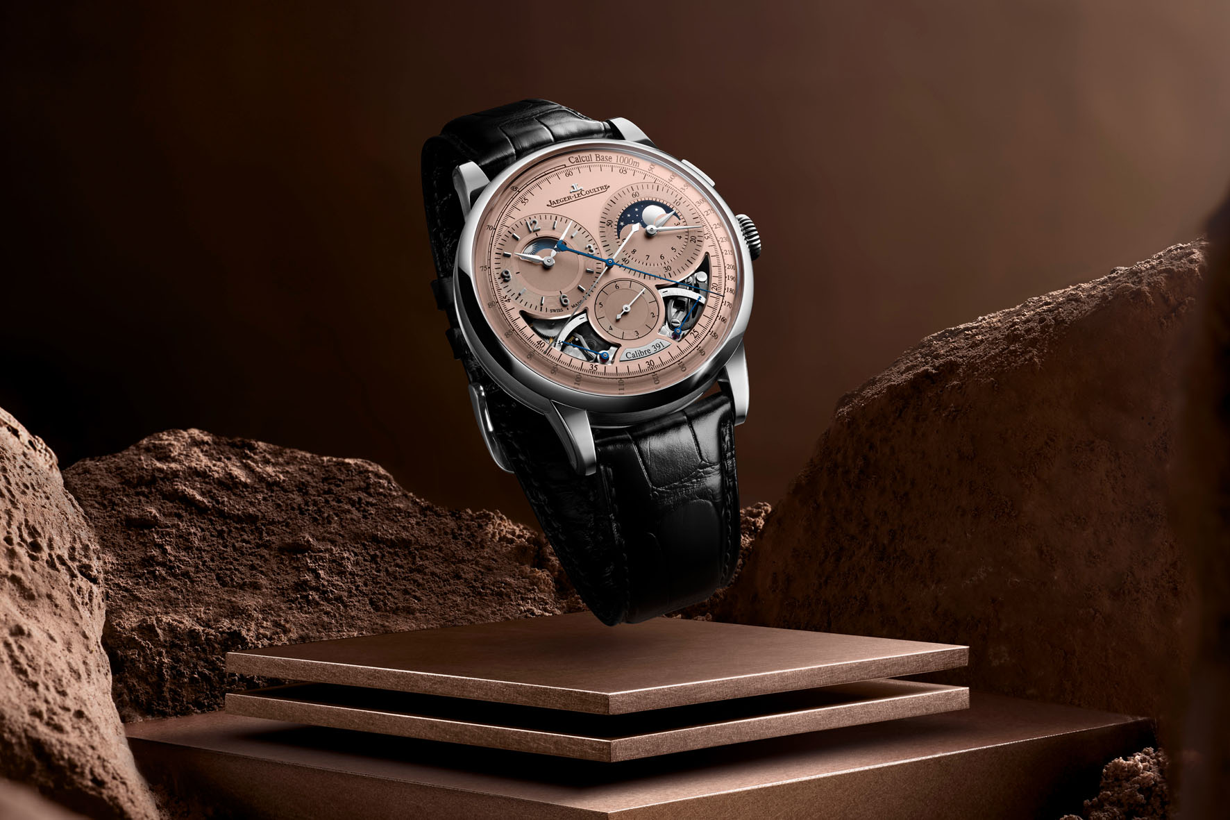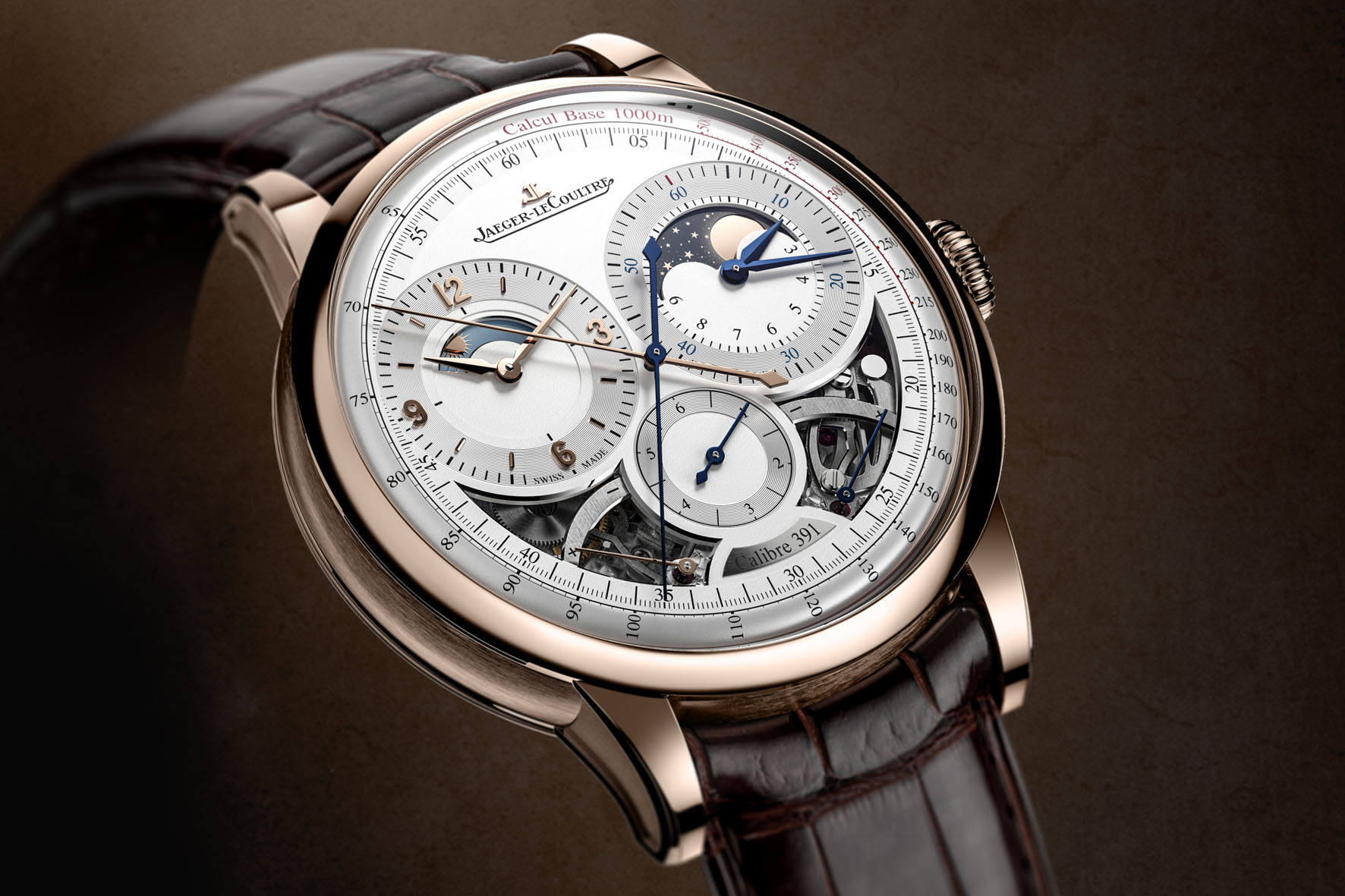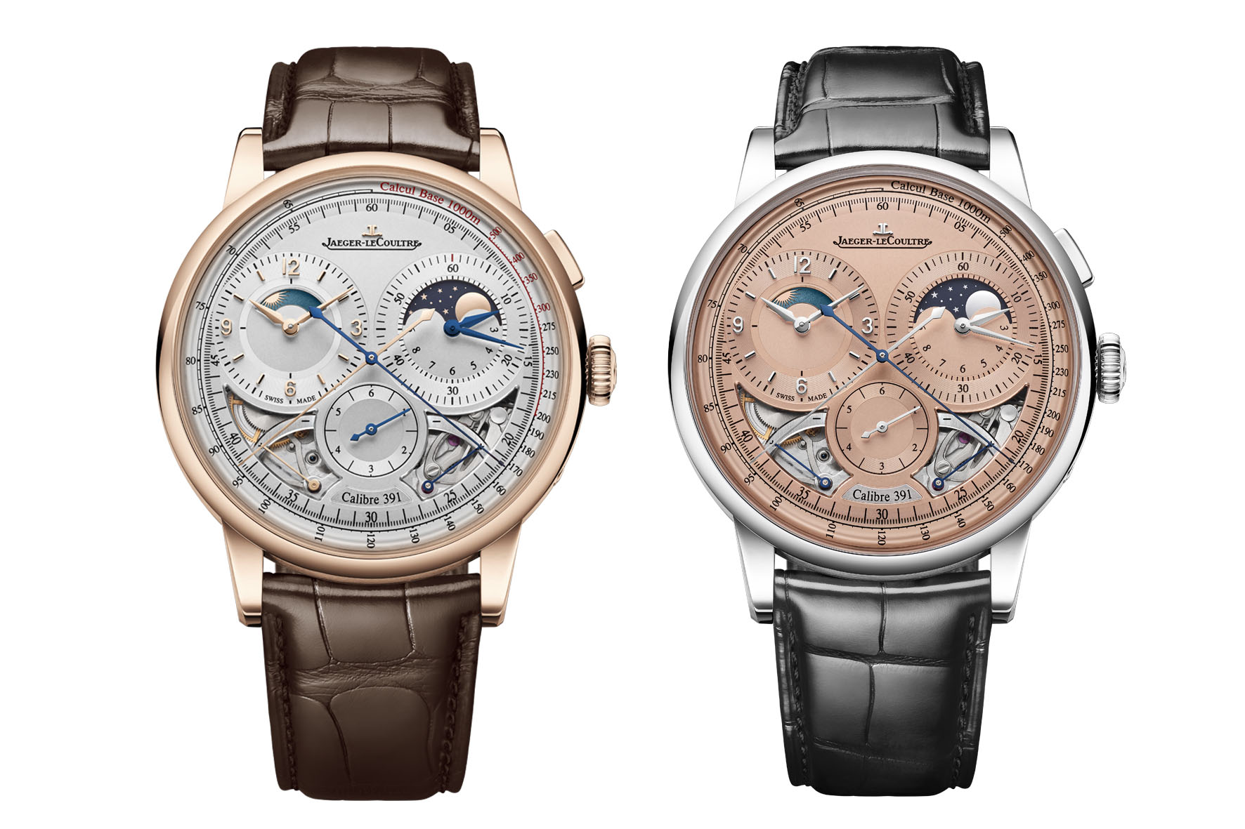 For Calibre 391, Jaeger-LeCoultre’s engineers started from the ground up to develop a fully integrated movement that combines a manually wound mono-pusher chronograph with moon phase and night-day complications, as well as two power reserve indicators and a seconde foudroyantedisplay.