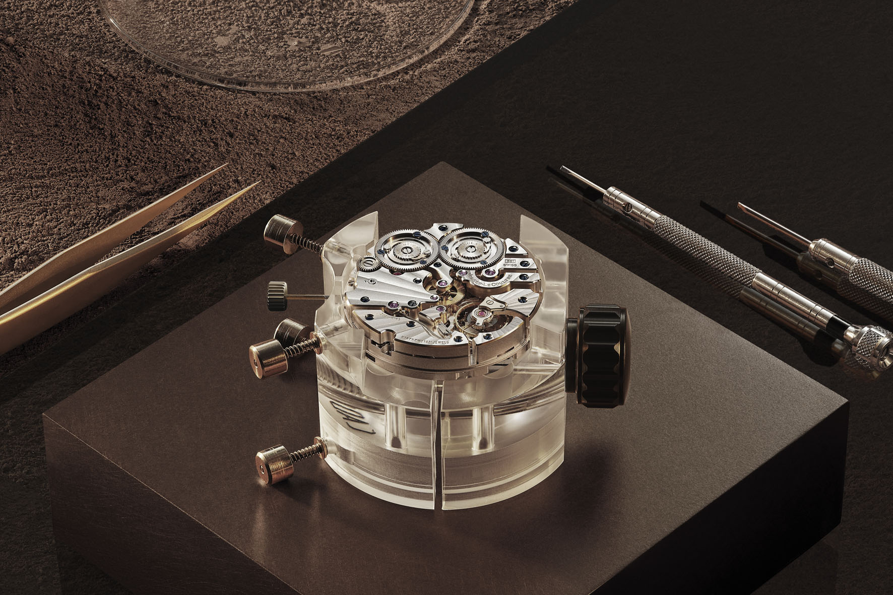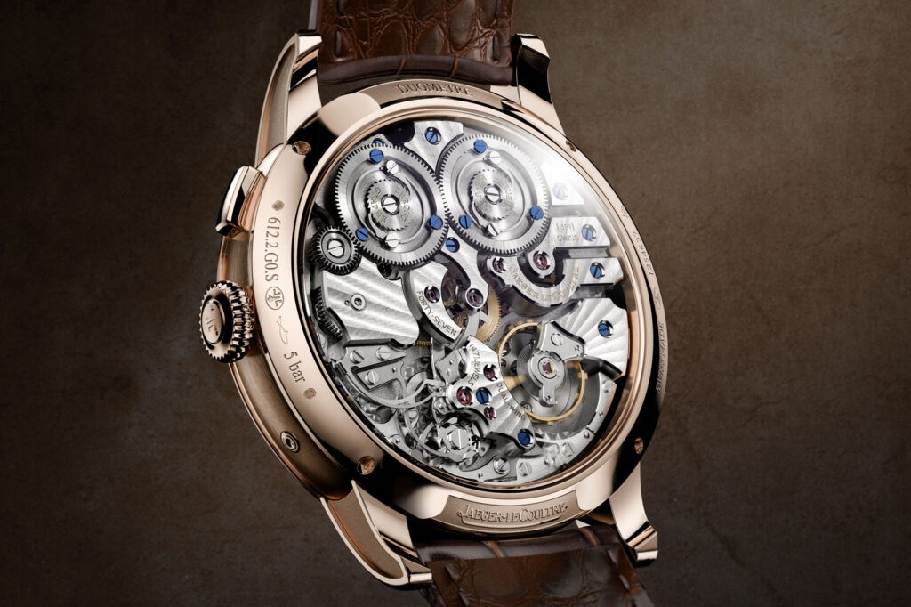 The search for a solution to this problem at Jaeger-LeCoultre during the early 2000s eventually led to the invention of the Duometre mechanism. Introduced in 2007 and patented by Jaeger-LeCoultre, it features two separate barrels and two independent gear trains – one to drive the escapement (for timekeeping) and one to power the complications – both integrated into a single calibre and linked to a single escapement. For the first time, it was possible to guarantee that the movement’s isochronism is not compromised by the operation of any complication.