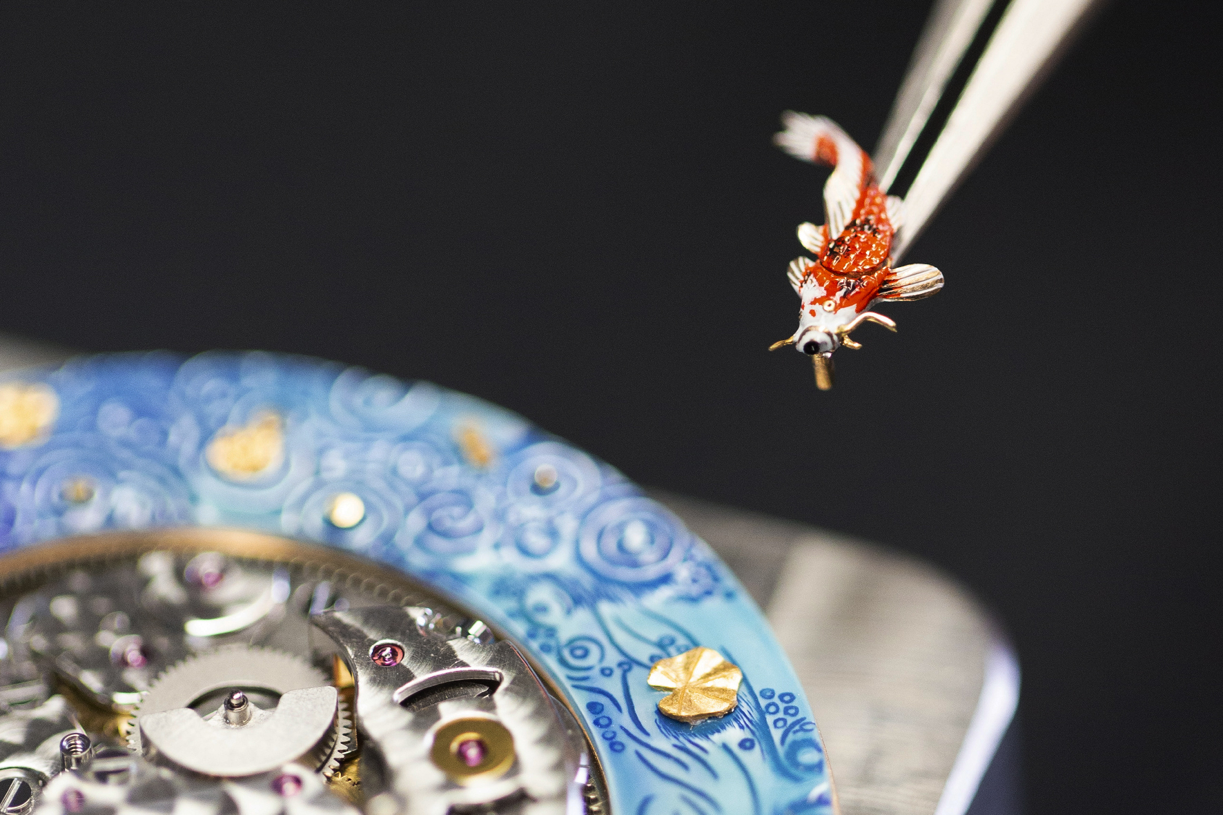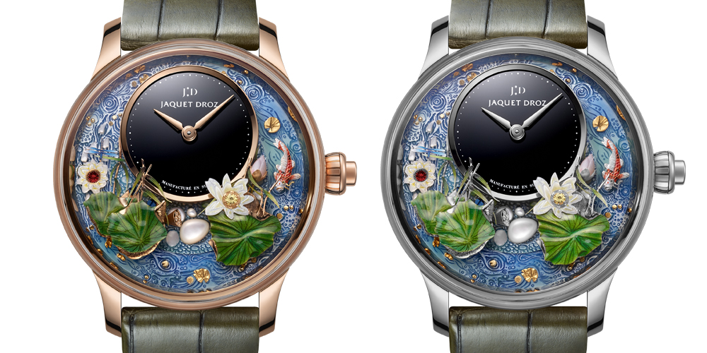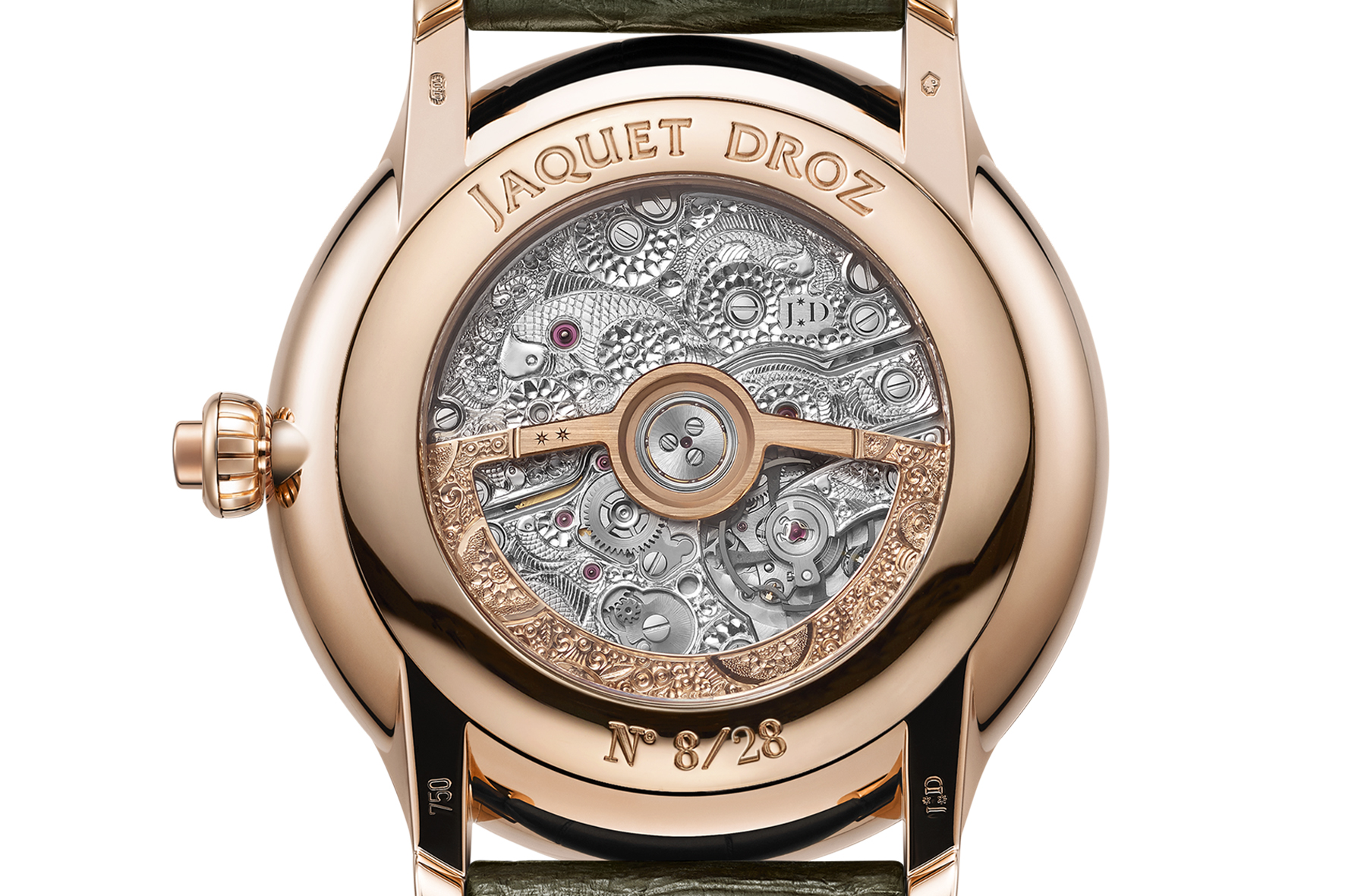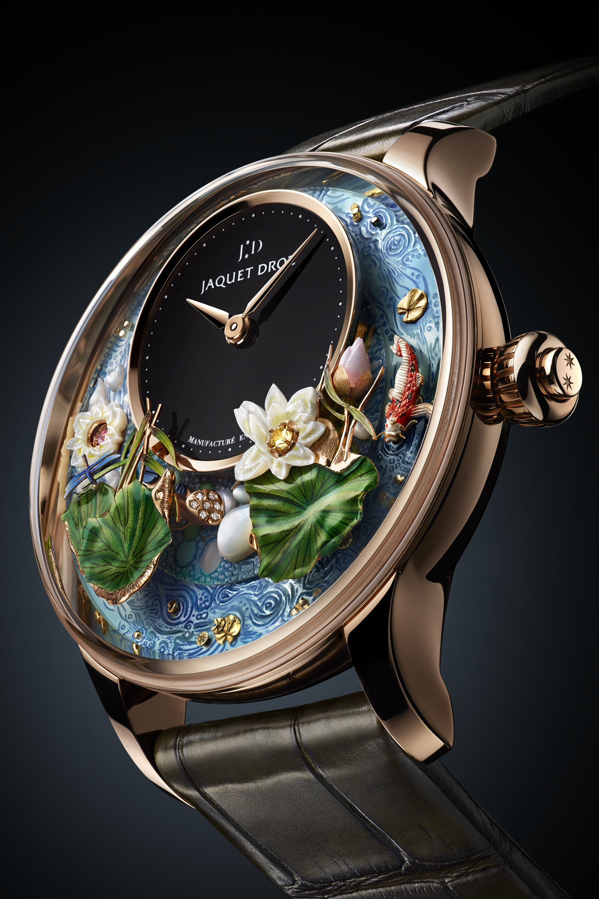 Turning over the timepiece, the bridges and oscillating weight are hand-engraved with exclusive naturalist motifs, with carp and Lotus flowers echoing the carvings on the dial side. The non-engraved elements on the movement are also decorated (circular graining, drawn strokes) and chamfered by hand. This new automaton is the subject of four patents pending. It features the most sophisticated dial ever produced by Jaquet Droz. The movement contains more than 500 components.