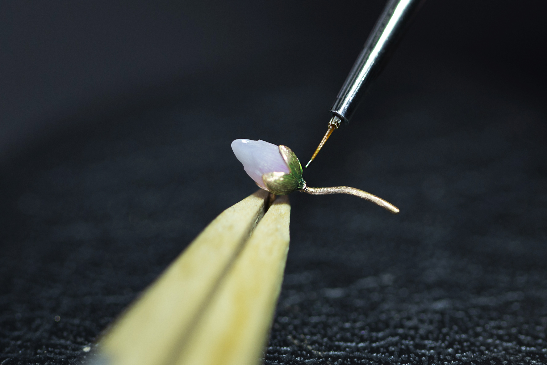 The dial of the Magic Lotus Automaton comprises three sections. The first is immobile: the onyx watch dial with gold hour and minute hands. It is surrounded by a crescent-shaped fixed disk that attaches the Lotus life cycle to the piece, with reed stems and three suspended Lotus leaves in Grand Feu enamel on a white gold or red gold base.