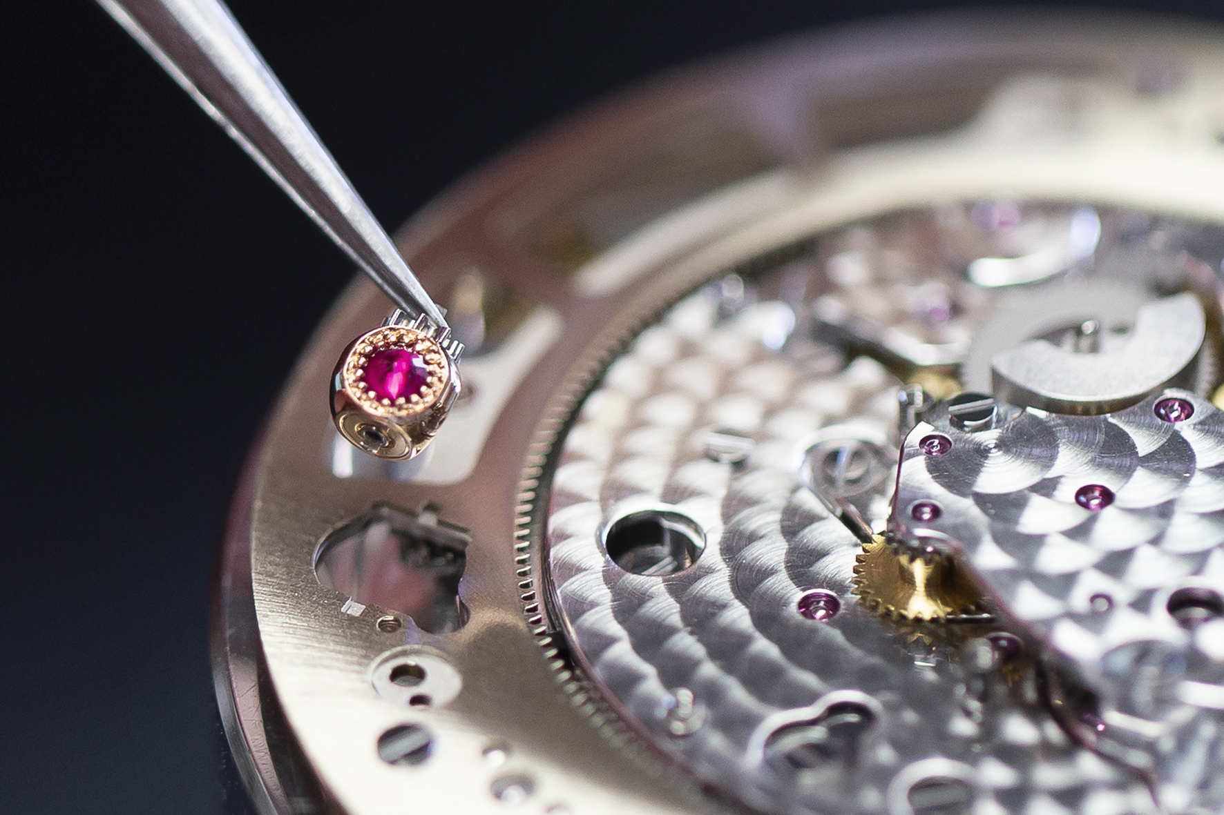 Hand carved in gold by the brand’s Master Craftsmen, the Koi is complemented by the floating Lotus animation opposite. Mother-of-pearl petals surround an unprecedented movement at the heart of the Lotus: each time it passes beneath the dial or leaves, it acquires a new stone – alternately blue sapphire, yellow sapphire and ruby. The same stone never appears in the same place from one rotation to the next. The color of the Lotus heart changes, invisibly, four times for every rotation around the river, and the same stone is never seen twice in a row.