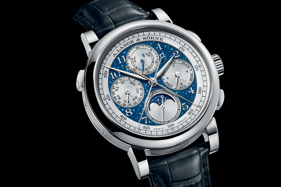 Artistic decorations of the 631-part manufacture calibre L101.1 reflect the technically ambitious multiple-complication timepiece. The German-silver train bridge is finished with a granular texture often found in the movements of historic pocket watches. Relief and tremblage engravings on the operating-lever, cover and chronograph bridges as well as on the rattrapante and balance cocks reflect the stellar motif of the dial.