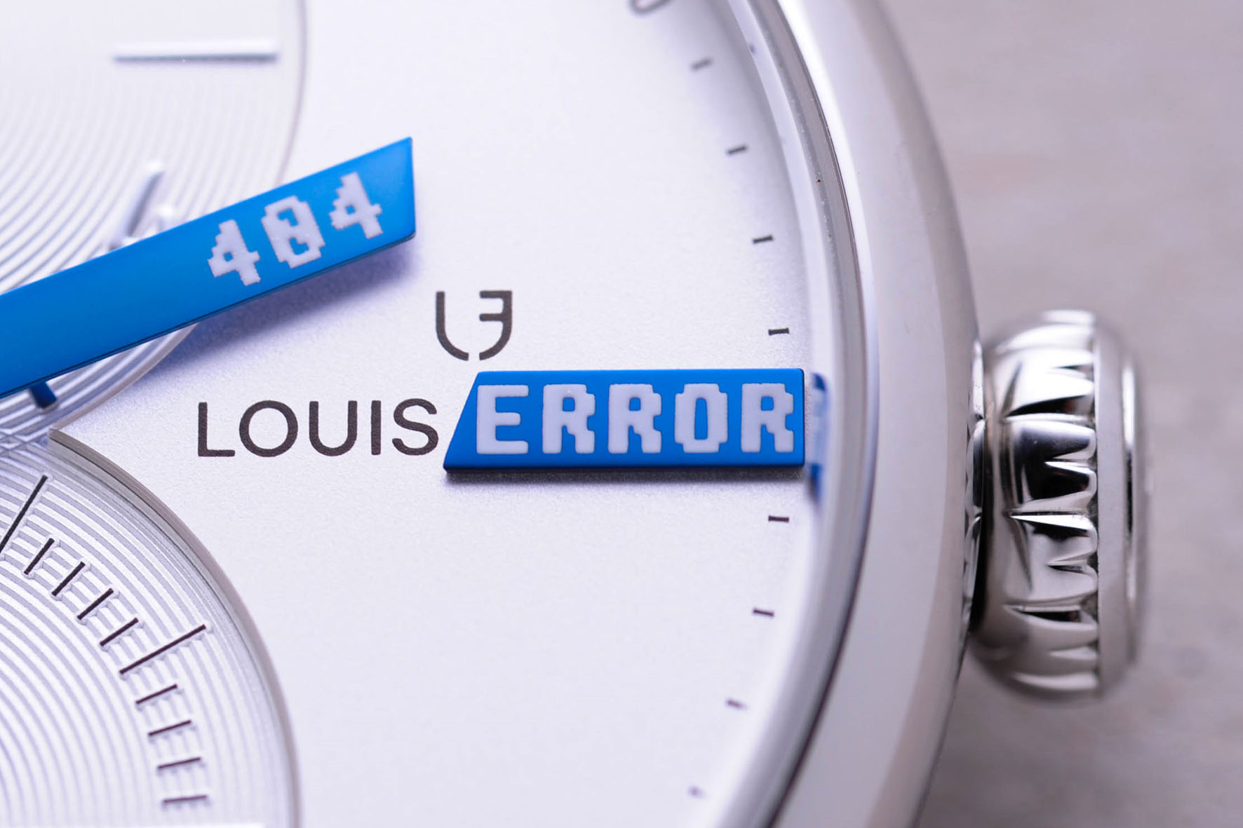 And Louis Erard has the courage to say so: human beings wouldn’t be complete without a good dose of humour and self-mockery. From Louis Erard to Louis Error. Le Régulateur, le régule à tort (wrongly regulates). Quelle erreur est-il? (What error is it?). Find the Error. 404 Error: just like faulty addressing in computing, there’s an error in the fitting — this hour does not exist. 404 Error: except that this hand returns to cross the dial with a blue line each time the minute strikes quarter to the hour. One small change, one big difference.