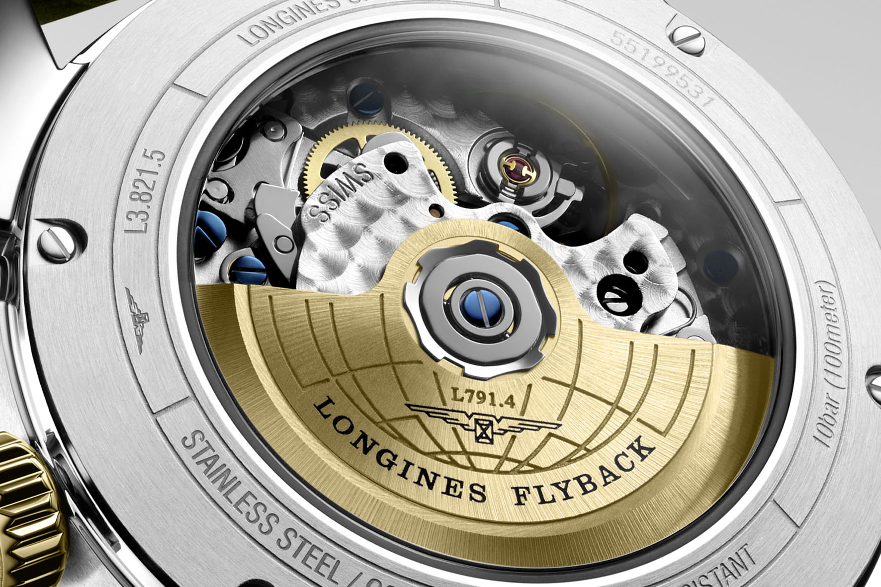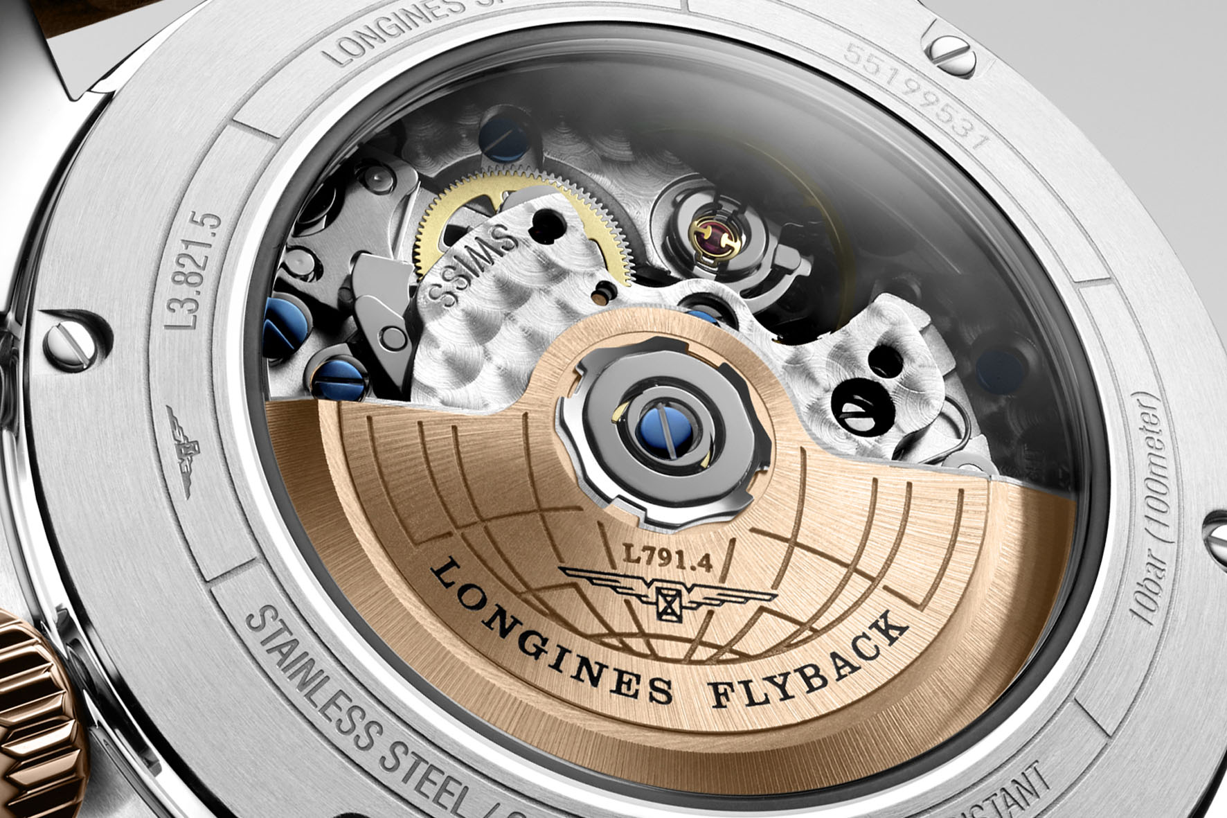 On the Longines Spirit Flyback, all this technical work has resulted in the automatic calibre L791.4, which equips the new steel and gold versions, as well as the previous steel and titanium ones. Developed on an ETA A08.L11 base, in addition to the flyback function it features the classic column wheel for sorting the chronograph functions. In terms of materials, the balance wheel has a silicon balance spring that makes the calibre insensitive to magnetic fields and temperature changes – now the standard for Longines movements. Thanks to these characteristics, the movement (which works at 25,200 vibrations per hour and has a power reserve of 68 hours) has passed the COSC tests and has deserved an official chronometer certificate. As for the other versions of the Longines Spirit Flyback, the calibre is visible through the transparent case back and is characterised by the oscillating weight reminiscent of the globe.