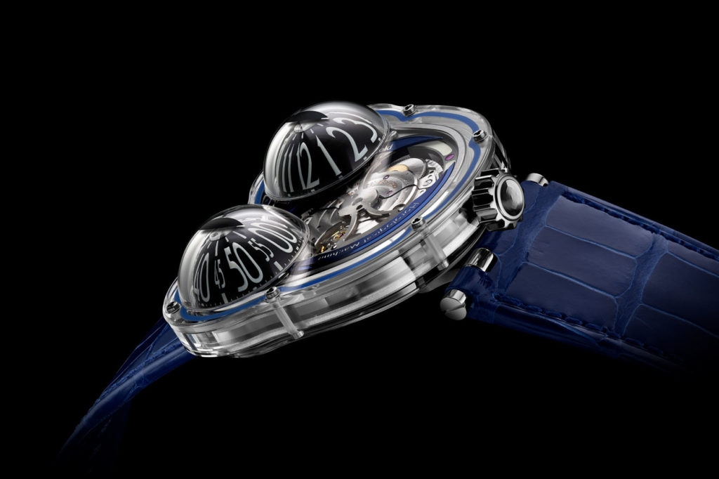 Two globular “eyes” that rotated to give the hours and minutes. A widely grinning “mouth” revealing the occasional bright flicker of the signature MB&F battle-axe rotor as it swept past a date scale. A glistening “skin” of titanium, red gold or exotic zirconium.