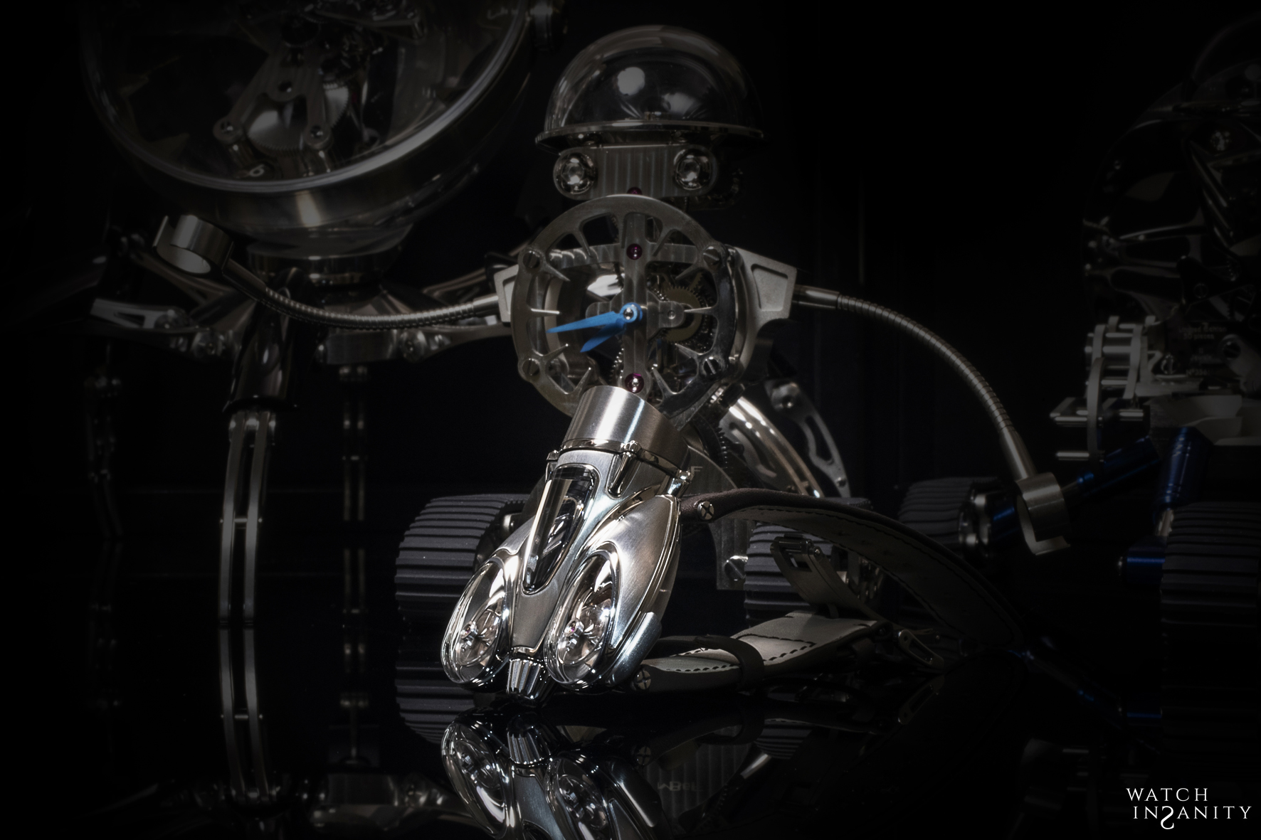 As well as Horological and Legacy Machines, MB&F has created space-age MusicMachines (1, 2 and 3) in collaboration with music box specialist Reuge; and with L’Epée 1839, unusual clocks in the form of a space station (Starfleet Machine), a rocket (Destination Moon), a spider (Arachnophobia), octopus (Octopod), and Medusa recently launched at SIHH and four robot clocks (Melchior, Sherman, Balthazar and Grant) – as well as a mechanical weather station (The Fifth Element).