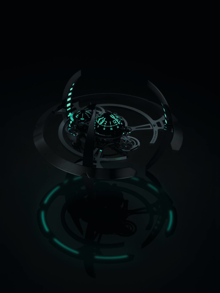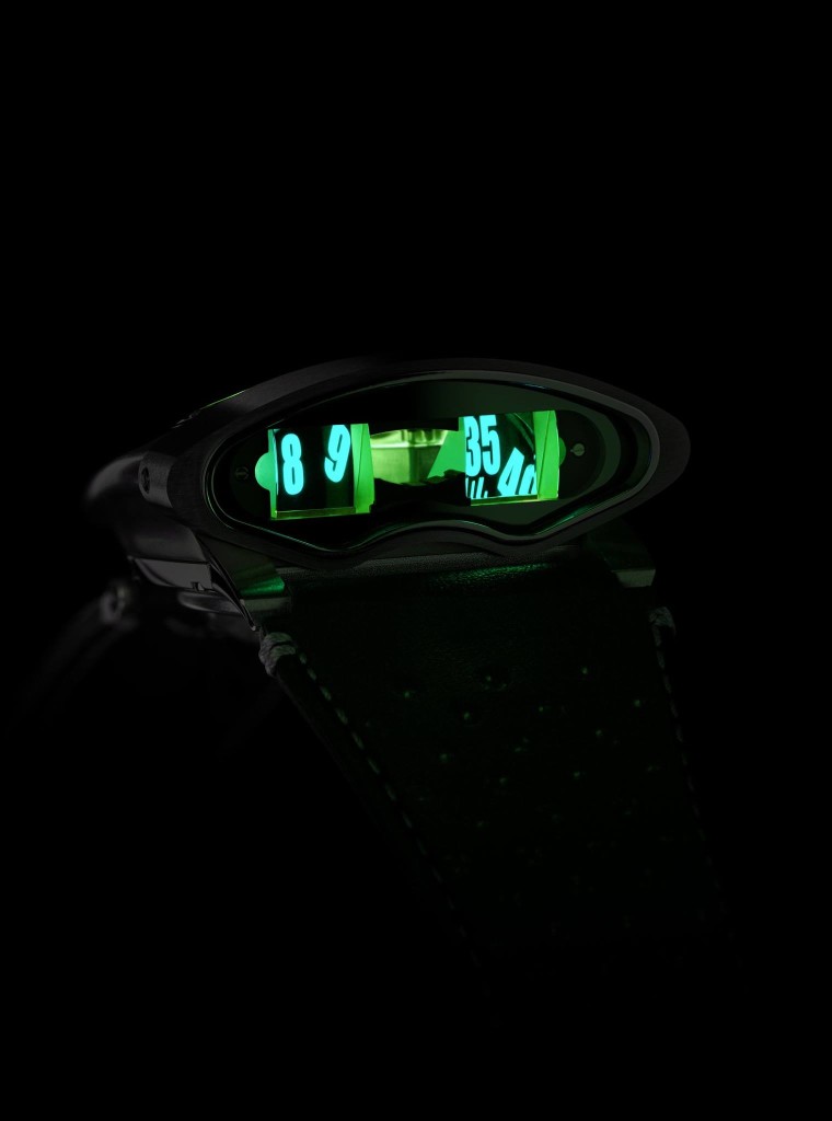 HMX displays bi-directional jumping hours and trailing minutes. Light streaming through the transparent Engine cover both illuminates the top of HMX’s Engine by day, and by night the brightly glowing lume provides its own colourful backlight to the time display.