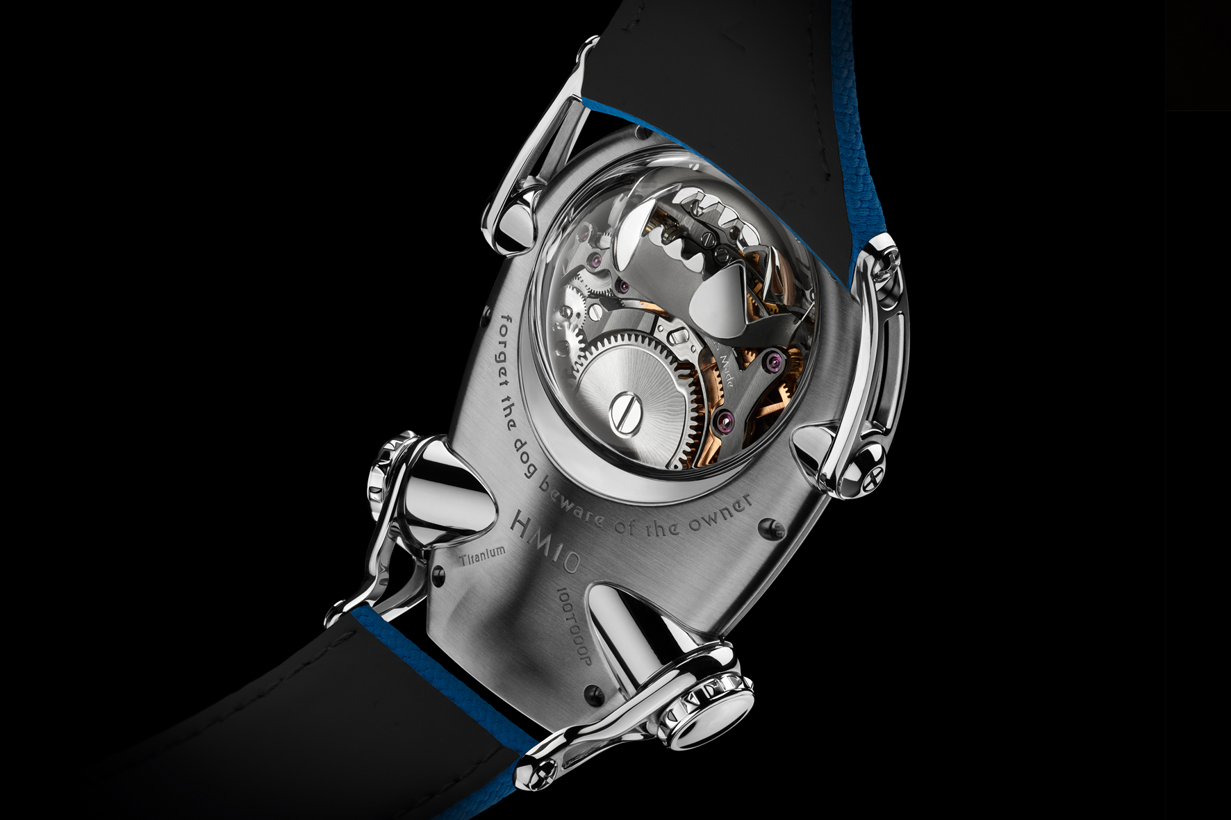 Despite its outsize personality — measuring 45mm across, 54mm from nose to tail and with a maximum height of 24mm — HM10 Bulldog is surprisingly wearable. Its sprung strap attachment “legs” allow the body to fit closely around the wrist, with the calf-leather strap as robust as any well-made leash — fastened with either a folding buckle or Velcro system.