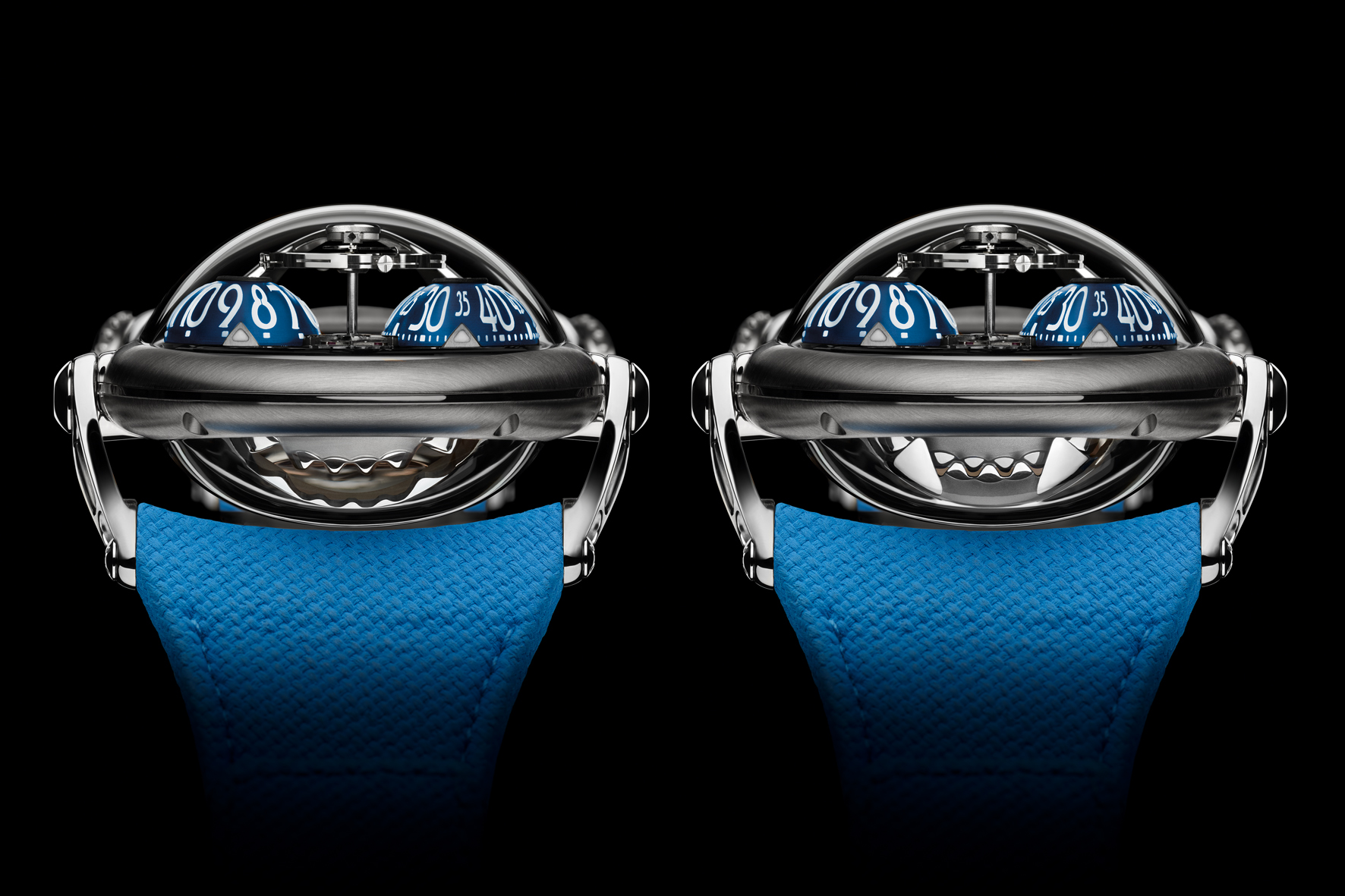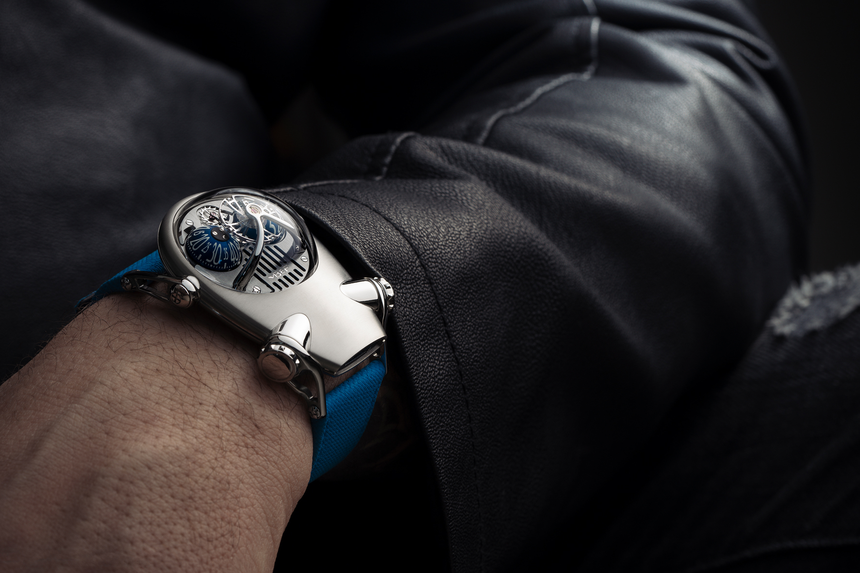 MB&F Horological Machine N°10 ‘Bulldog’ is available in two launch editions : grade 5 titanium body with blue “eyes”(€ 95.000 + TAX), and 18k red-gold and titanium body with black “eyes” (€ 105.000 + TAX).