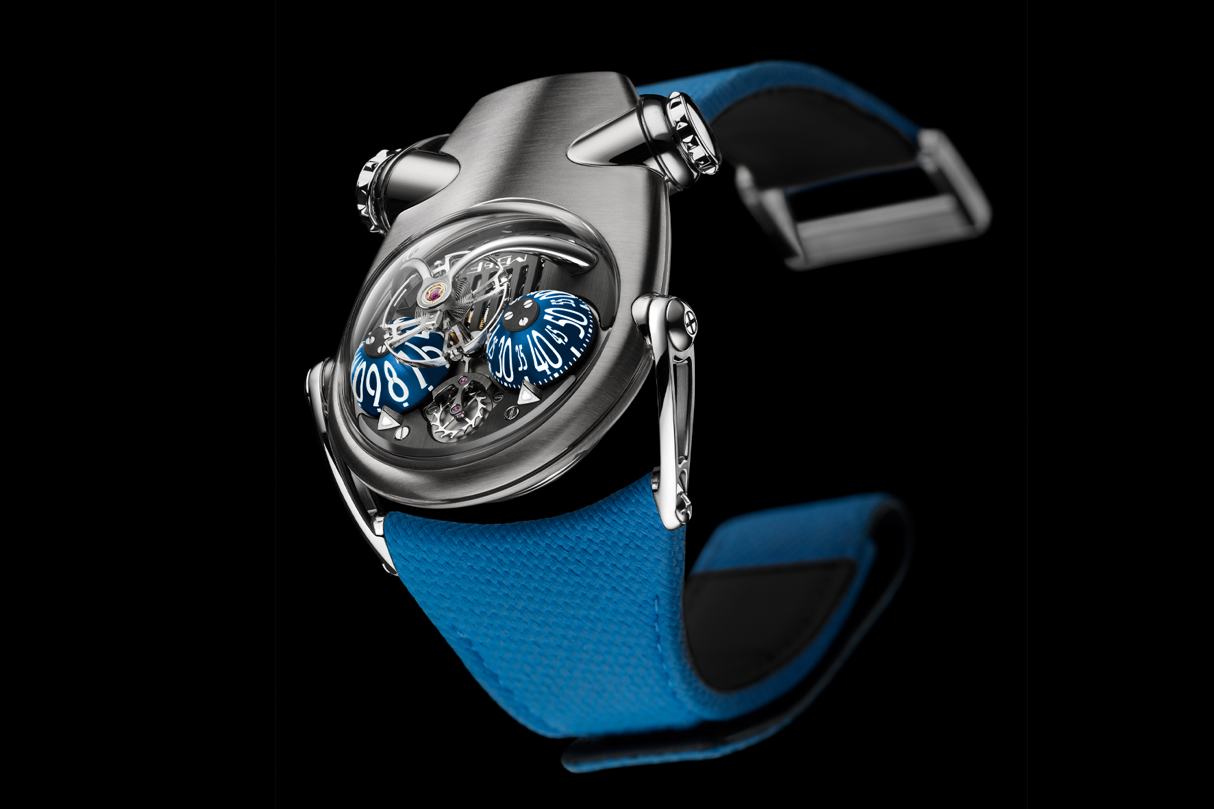A rounded, compact body of titanium or red gold, coupled with a generous ration of sapphire crystal. Two prominent aluminium time-display “eyes”, rolling at anyone who dares look its way. A collar studded with projections that allow you to wind the mainspring or set the time. Stout but flexible “legs” that wrap firmly around your wrist. A massive jaw. And above all, a big heart beating steadily at 2.5Hz (18,000vph).