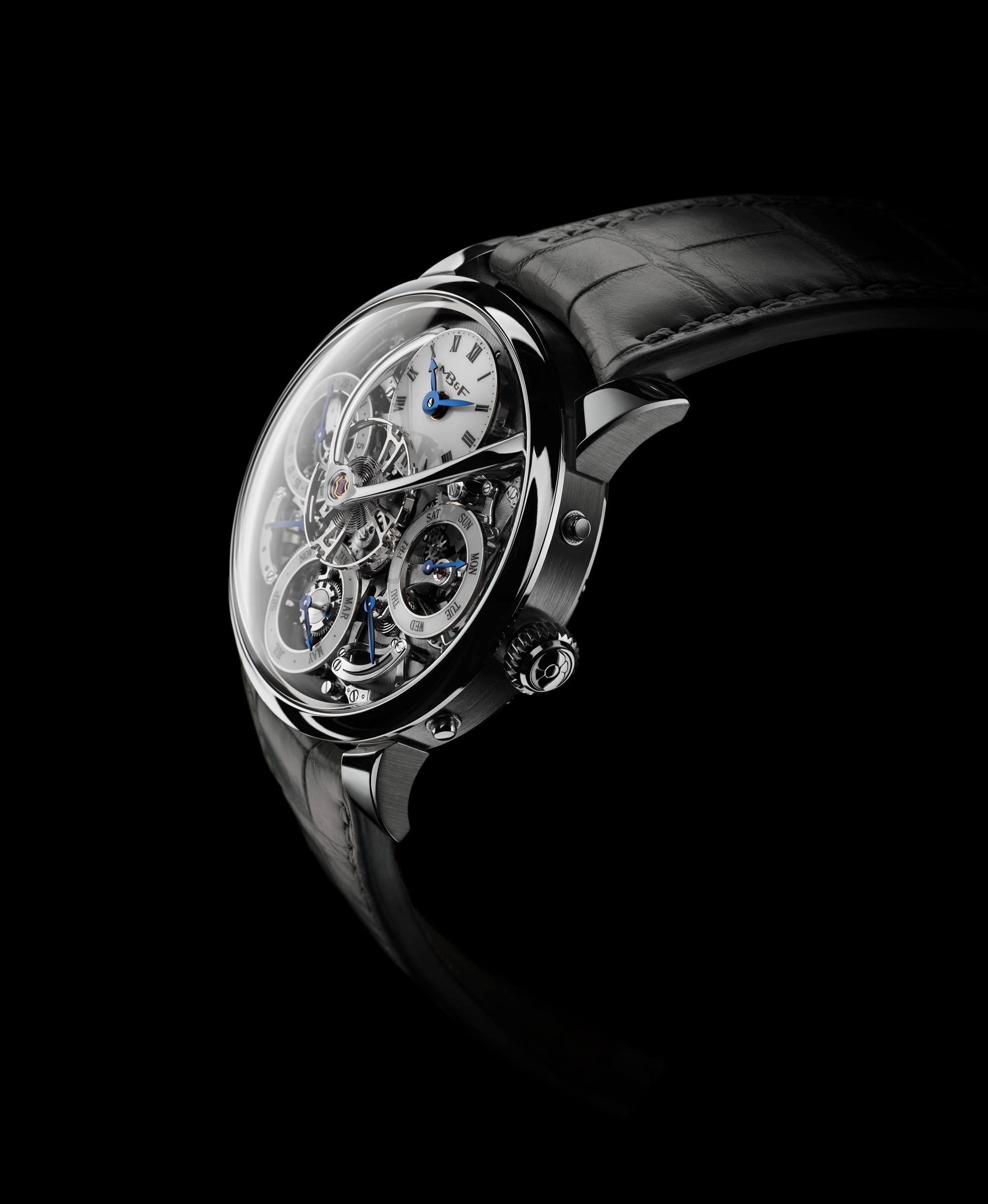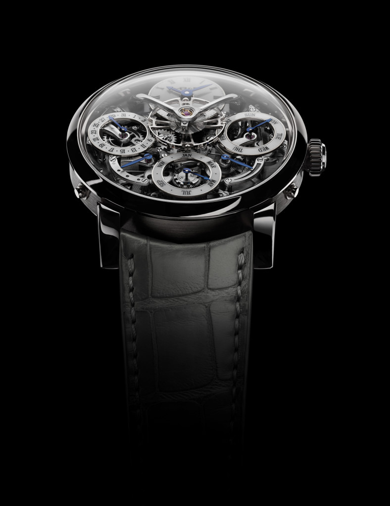 Using an innovative system developed especially for Legacy Machine Perpetual, the subdials appear to “float” above the movement with no visible attachments. The skeletonised subdials rest on hidden studs, which is technically impossible with traditional perpetual calendar mechanisms because they would block the movement of the grand levier.
