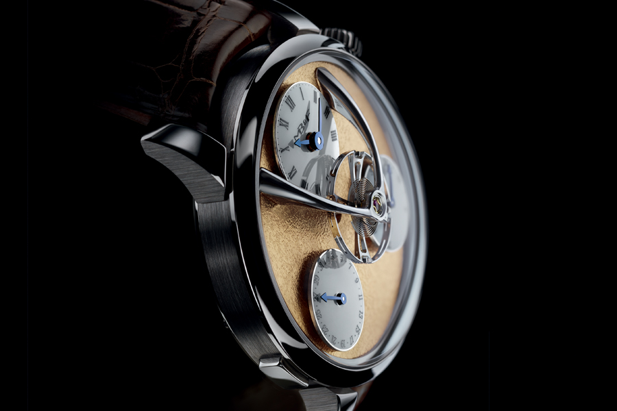 11 October 2017There is one technical constant that defines every single watch in the MB&F Legacy Machine collection. Functions may vary, and different complications come to the fore in each edition, but the suspended balance wheel remains literally and metaphorically above everything else. In Legacy Machine Split Escapement, this feature is not only highlighted, but raised to another level of achievement.