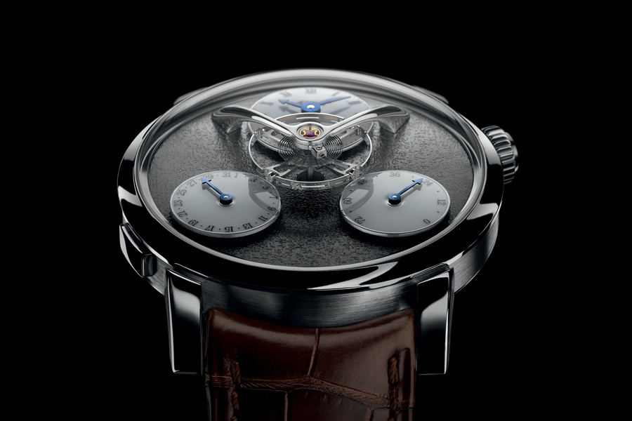- Ruthenium frosting with similarly darkened movement evoking new-millennial functionality and putting the focus on the white lacquer dials.