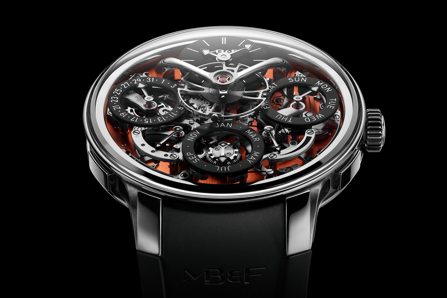 Although the 44mm diameter is unchanged from its 2015 iteration, the new EVO case design features a no-bezel construction, with the domed sapphire crystal fused directly to the case. The increased openness of this design highlights the equilibrium between the legibility of LM Perpetual EVO’s calendar indications and the cinematic play of the engine components — surmounted by the iconic MB&F hovering balance wheel.