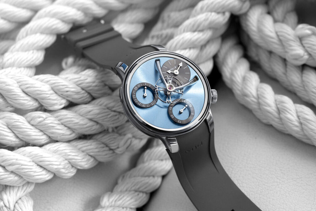 MB&F is now unveiling not one, but two new LM SE EVO editions. The first comes in grade 5 titanium with an icy blue base plate and slate grey dial and opened counters…