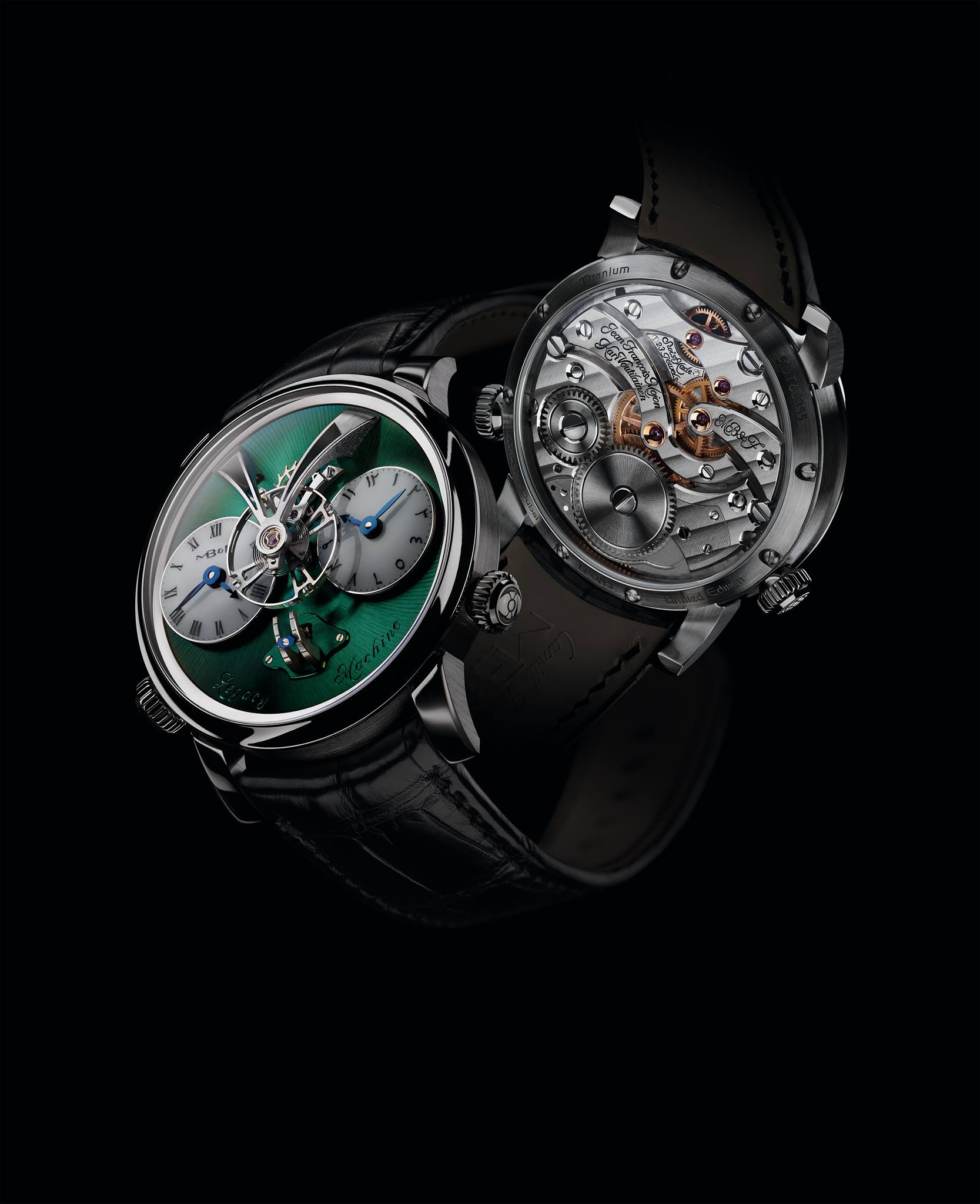The LM1 M.A.D. Dubai edition is easily distinguished from its stable mates by the eye-catching vivid green of its CVD-treated movement main plate, as well as the Arabic-Hindi numerals of the “home time” sub dial. It is also worth emphasising that LM1 is one of very few dual time zone watches offering completely independent setting of both hours and minutes. Green CVD has only recently become an option; the colour has long been considered too unstable for commercial applications. While applying green CVD is a long process, light playing over the verdant surface creates spectacularly contrasting hues of blue and purple.