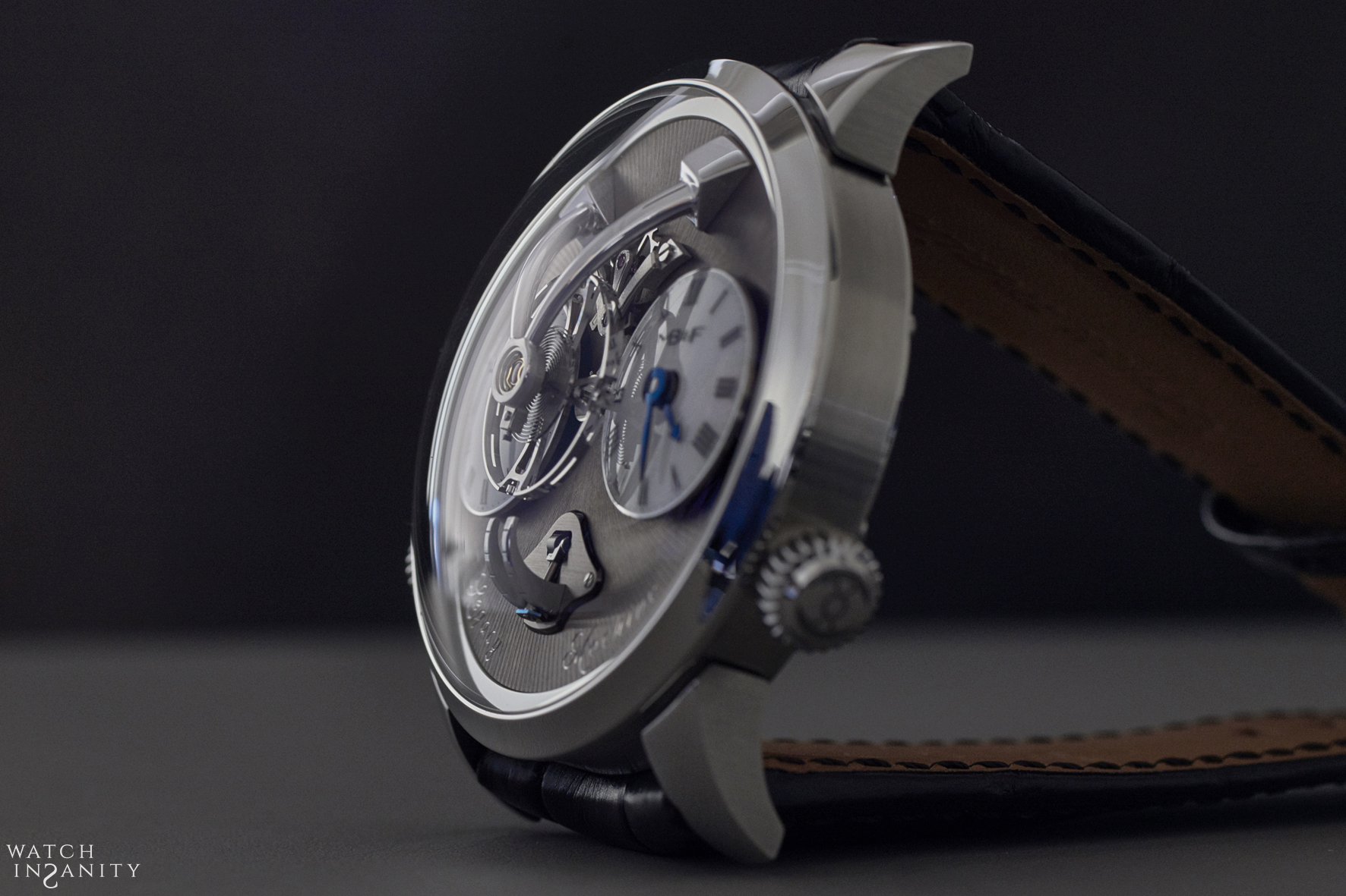 When Max turned the watches and showed us the dial side I remember my heart starting to beat very fast. The huge flying balance wheel was held by two bridges on top of two small and elegant lacquered dials with roman numerals, and a strange lever placed at 6 o’clock, we learned after that it was the first vertical power reserve ever done.