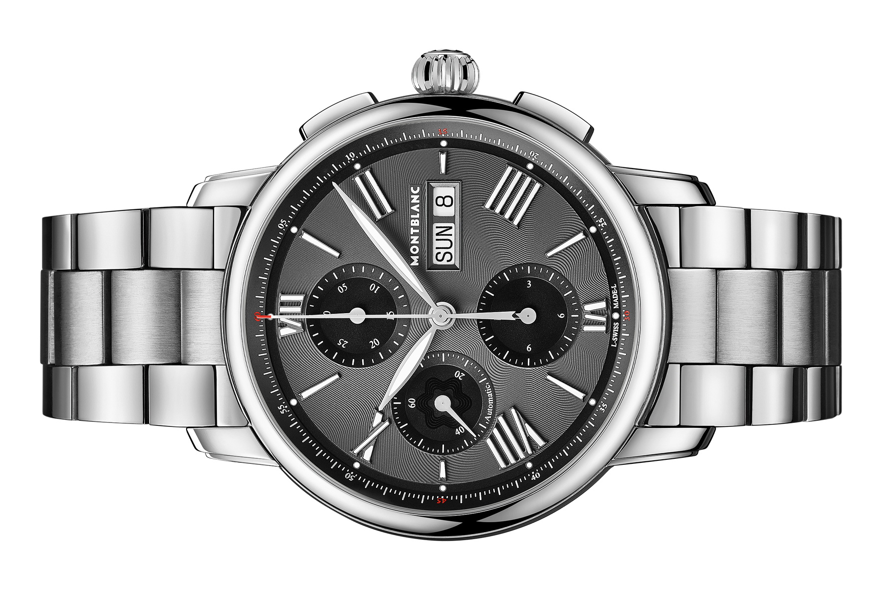 The new Montblanc Star Legacy Chronograph Day&Date is housed in a 43mm stainless steel case with a domed sapphire crystal on the front and a sapphire crystal on the back, allowing the wearer the possibility to admire the MB25.07 automatic chronograph movement beneath.