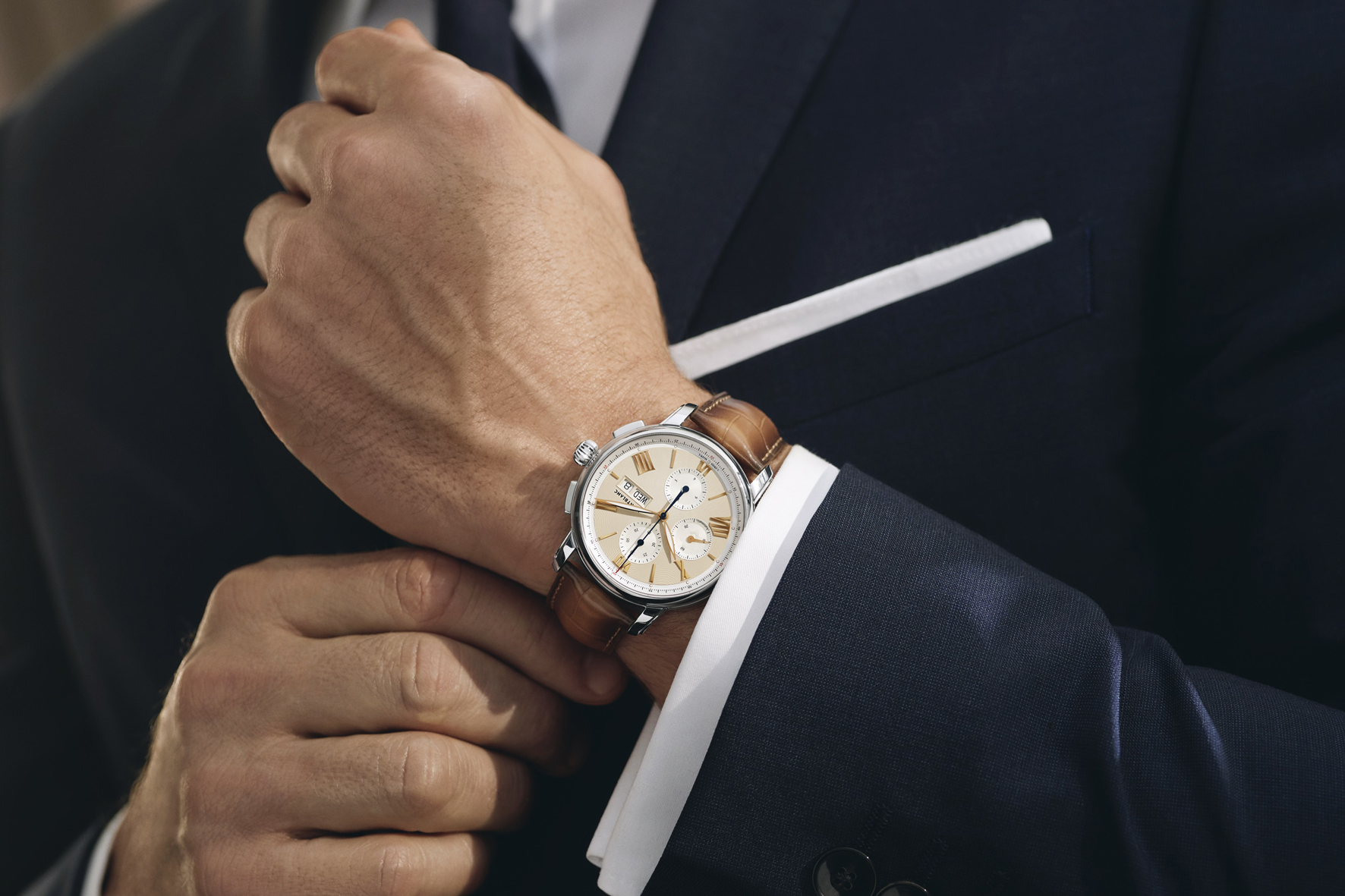 There are two dial colours, one in ivory with a silvery-white flange and counters that features 18 K rose gold-coated Roman numerals, indexes and hands for the time functions and blued hands for the chronograph readings, and another that comes in anthracite with black rhodium coated Roman numerals, indexes and hands enhanced with luminescent material SuperLuminova for a better readability at night.