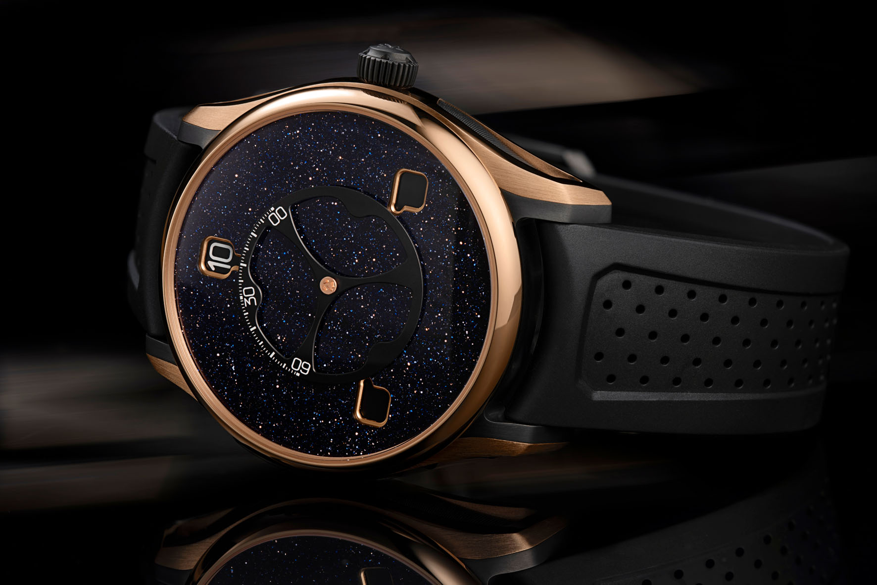 The Pioneer Flying Hours is available in two models, housed in a 42.8 mm case. The first, in 5N red gold with black DLC titanium inserts, features an aventurine dial which evokes a deep and mysterious constellated sky. It is limited to 100 pieces, as rare as they are spectacular (Price CHF 39,000 + TAX).