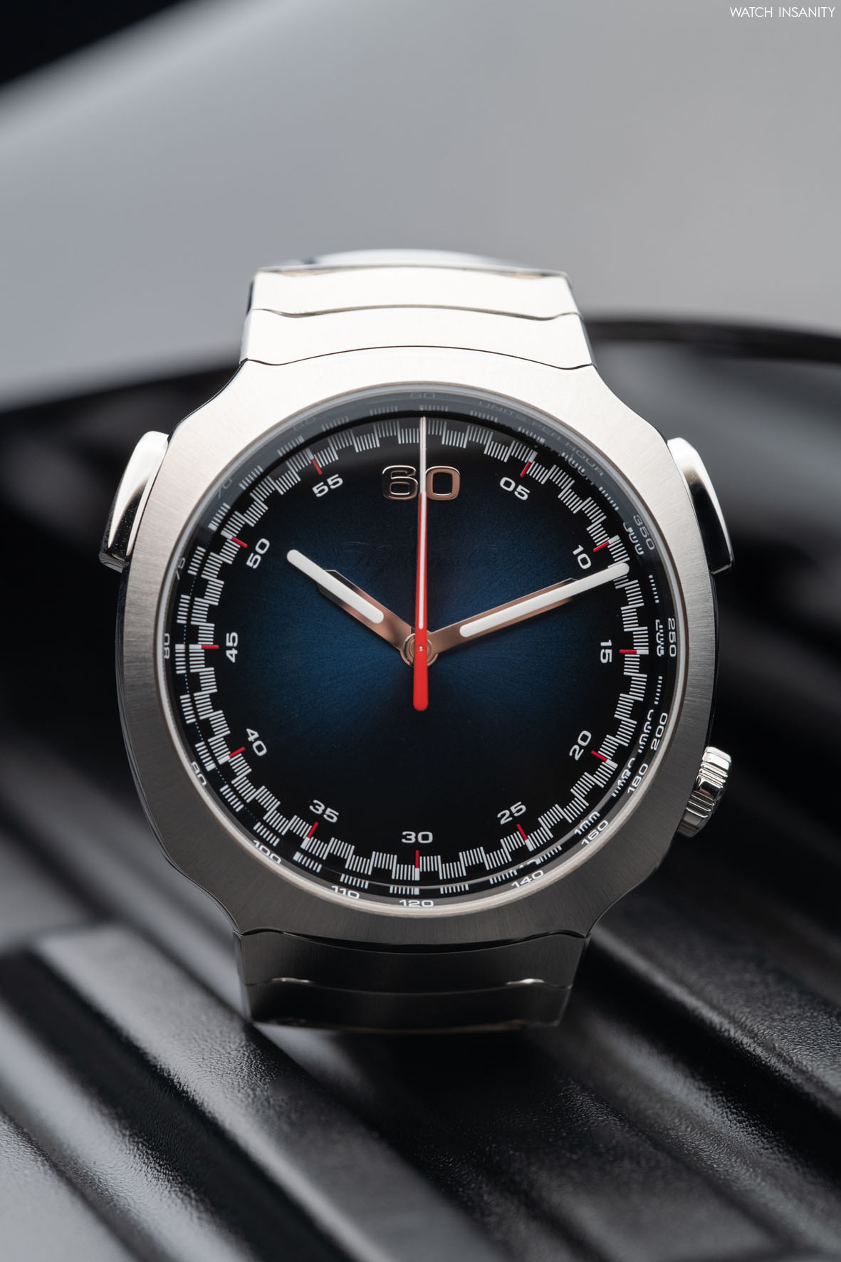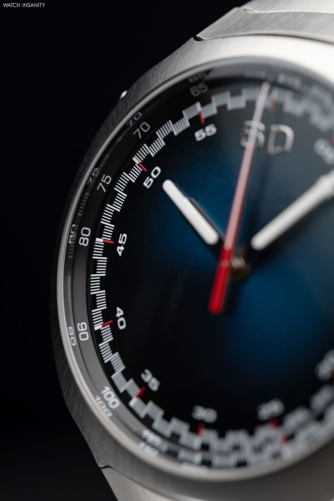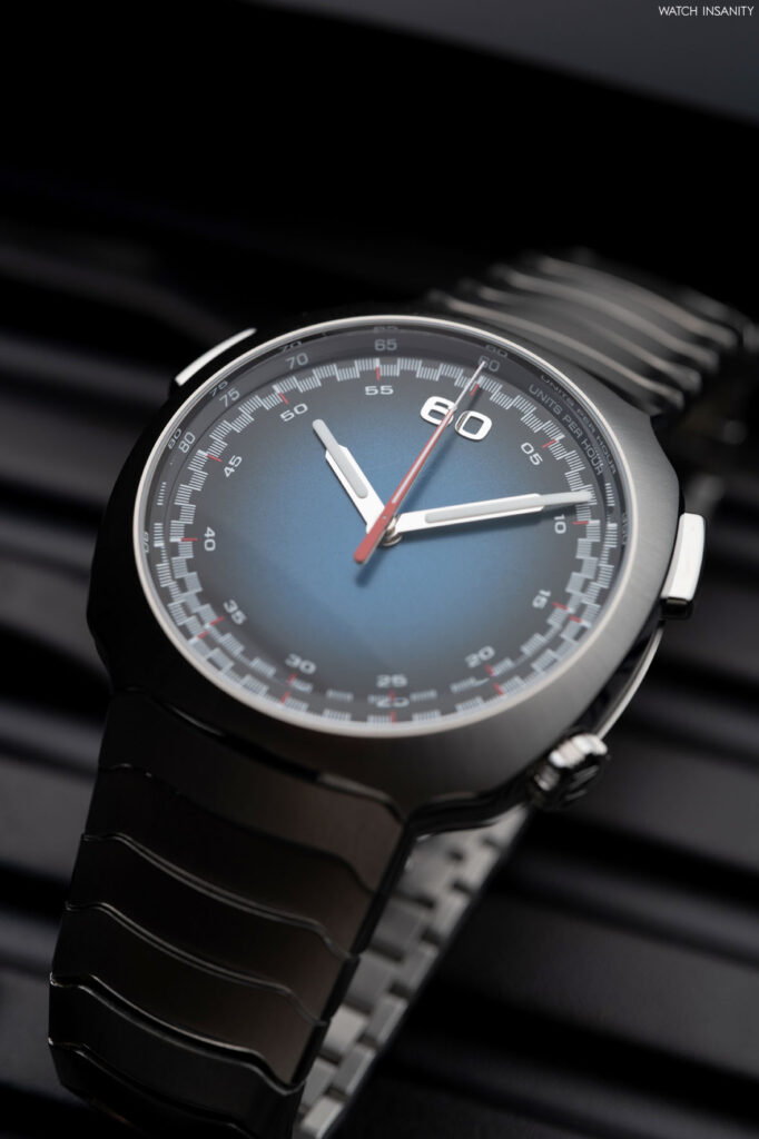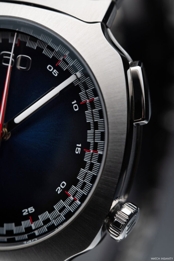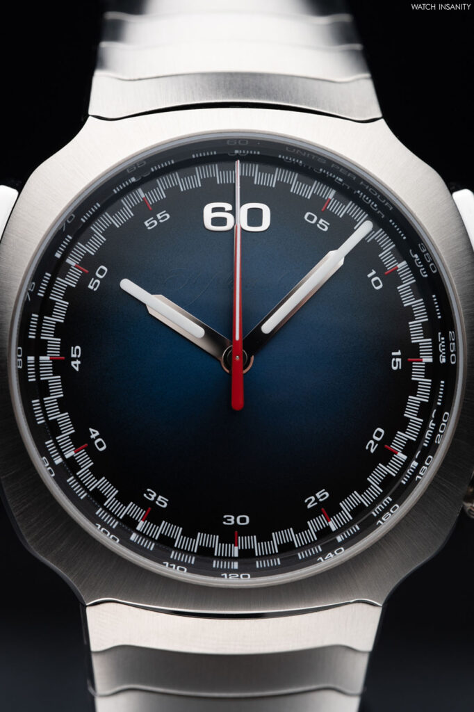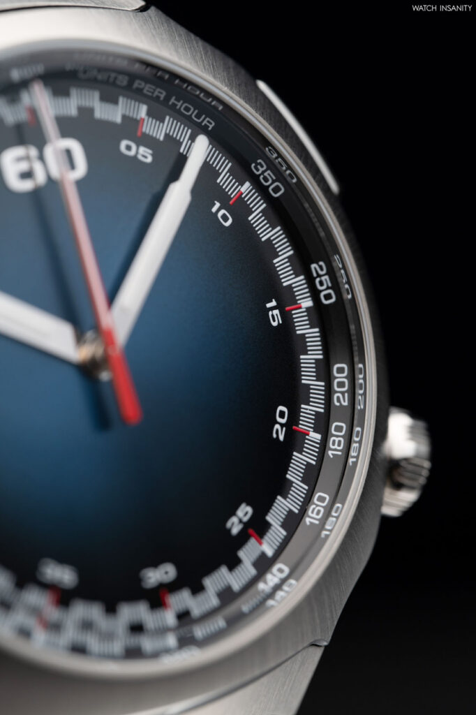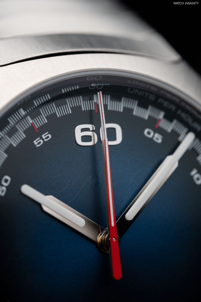 Meanwhile, for this evolution of its chronograph, the Schaffhausen-based manufacturer is introducing the transparent lacquer logo on the Funky Blue dial, an exclusive H. Moser & Cie. signature – a feature that the brand had already introduced on the Pioneer MEGA Cool and which, as you can see from our shots, is extremely elegant.