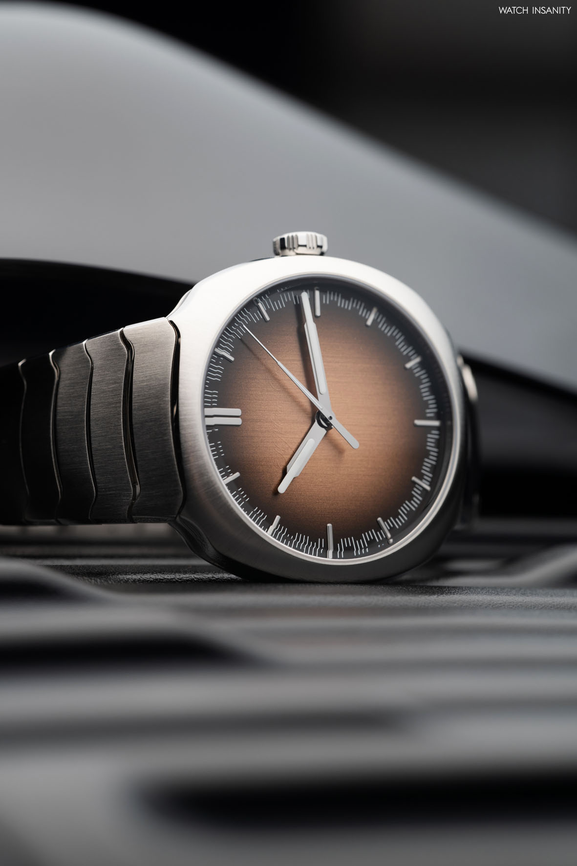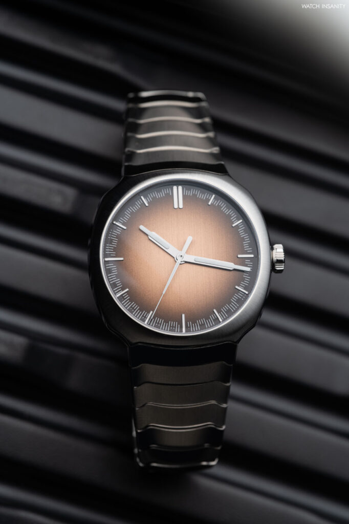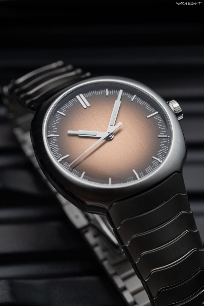And then there is the dial. You know, H. Moser & Cie. is also and above all famous for its dials, which are frankly inimitable. That of the Streamliner Centre Seconds Smoked Salmon definitely stands in a higher category. Apart from CEO Edouard Meylan‘s stories about the origin of the colour, which you can read here and which serve to tell a story before narrating a product, having shot this watch has allowed us to fully understand why this smoked salmon is so special in its Swiss version.