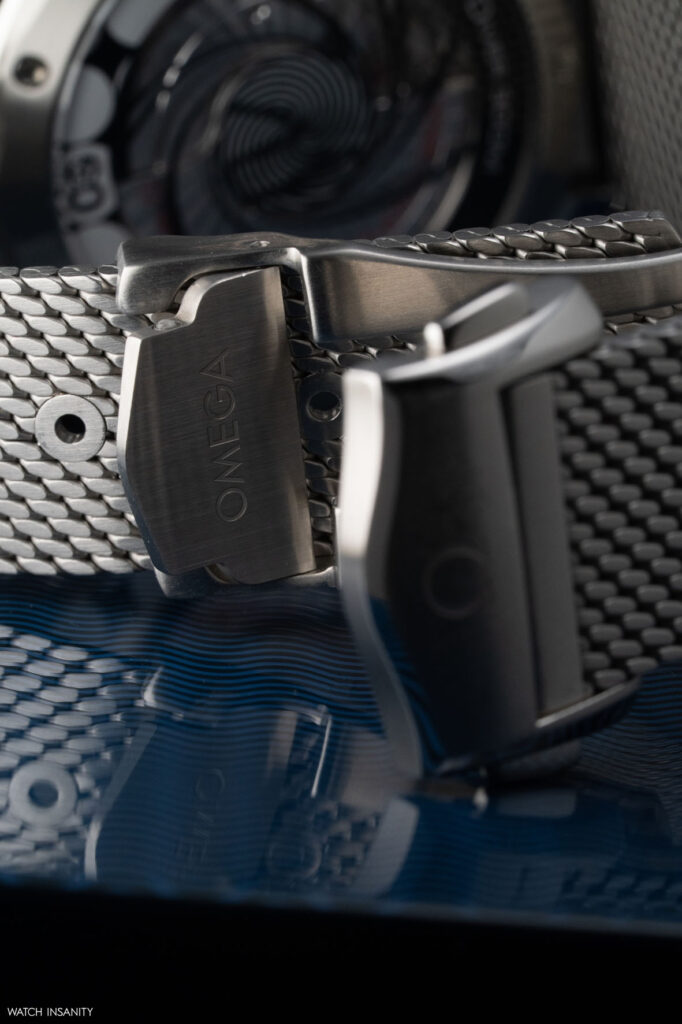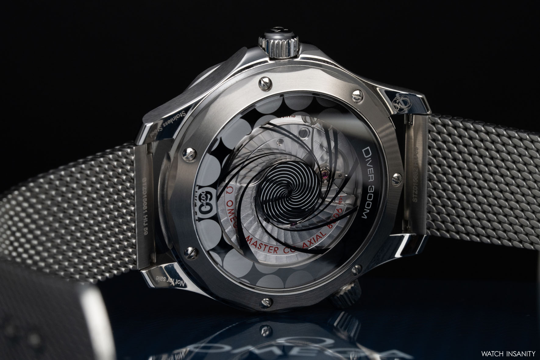 Omega’s masterstroke on this watch is in the case back. If the No Time To Die had a solid case back, with engravings inspired by the military tradition, this one is completely different. The brand uses a “special effect” that reminds of the one on the Speedmaster Silver Snoopy Award 50th Anniversary. There, the case back came to life thanks to Snoopy and its space capsule in which the dog orbited the Moon. Here, the sapphire crystal case back is decorated with a design created thanks to a micro-structured metallization, which recalls the classic gun barrel in the opening scenes of the 007 films. At the bottom of it, in the center, there’s the secret agent’s silhouette.