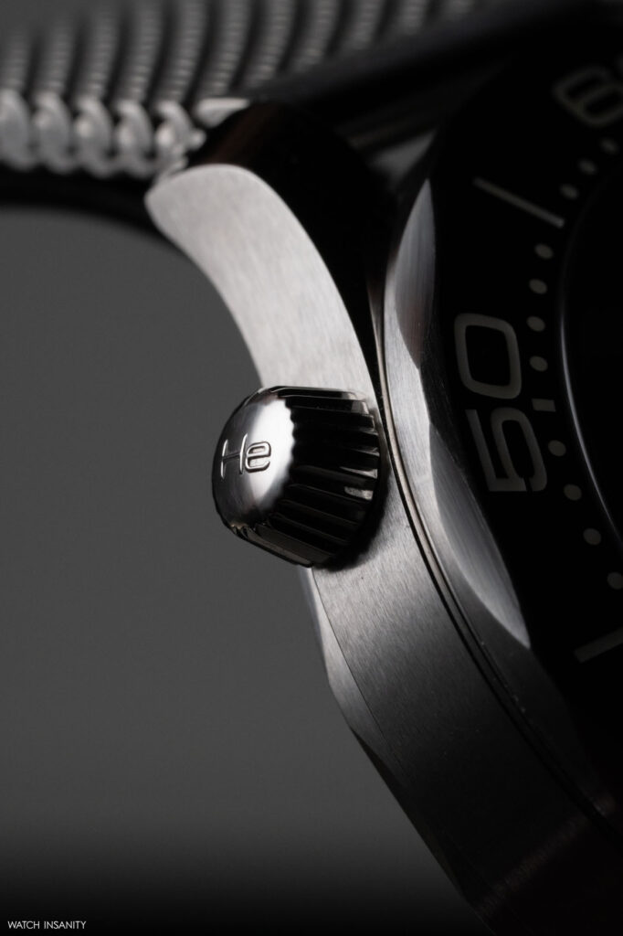 Just to begin with: the case. 42 mm of solid steel worked by alternating satin-brushed and polished surfaces. It keeps the Seamaster’s classic look, with curved lugs, a fluted unidirectional bezel and a helium-escape valve at 10 o’clock. Water resistance to 30 bars is guaranteed by the screw-down crown, the screwed-down case back and the sapphire crystal; the latter is one of the few variations from the original Seamaster 300M, because Omega has kept the glassbox crystal of the No Time To Die, and not the classic domed sapphire of the standard Seamaster Diver 300M.