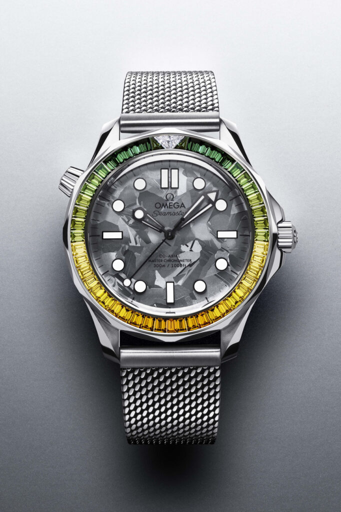 For the sake of completeness, we must remember that Omega celebrated 60 years since the first 007 film with another showier Seamaster Diver 300M. The only point of contact between the two models is the animated case back. Here, in fact, the steel of the case and bracelet is replaced by Canopus Gold – the white gold alloy with a special brilliance developed by Omega; the aluminum of the dial by natural gray silicon – whose crystallites make each dial unique; while the blue aluminum of the bezel is paved with natural diamonds, ranging from green to gold.