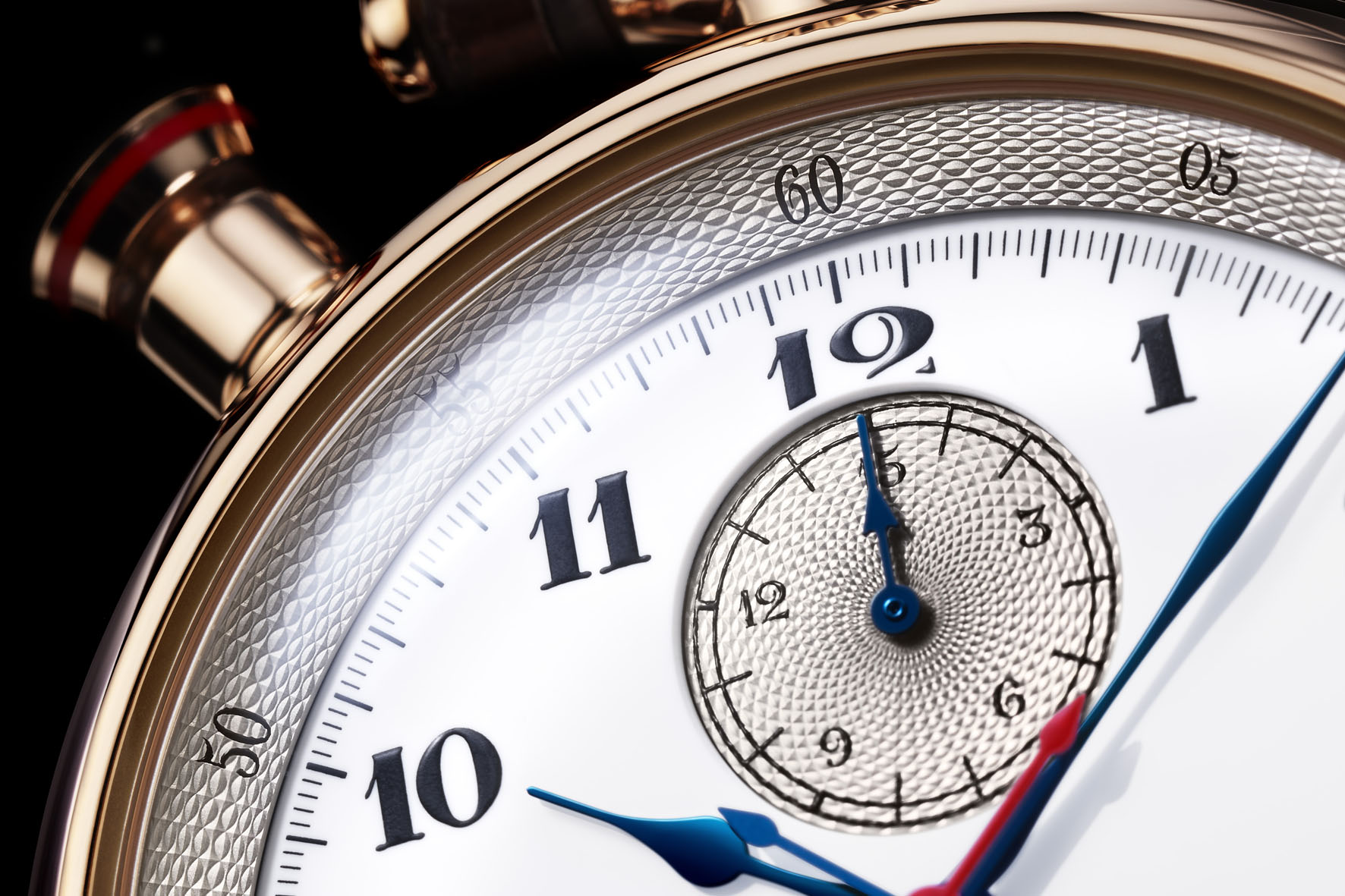 On the dial, the 18K SednaTM Gold central hour/minute hands are in blued PVD, as are the subdial hands on the small seconds at 6 o’clock and 15-minute recorder at 12 o’clock. For easy readability, the display includes a blued CVD central seconds hand and red-varnished split-seconds hand. There is a further tribute to 1932 in the Arabic numerals and minute track in black “Petit Feu” enamel.