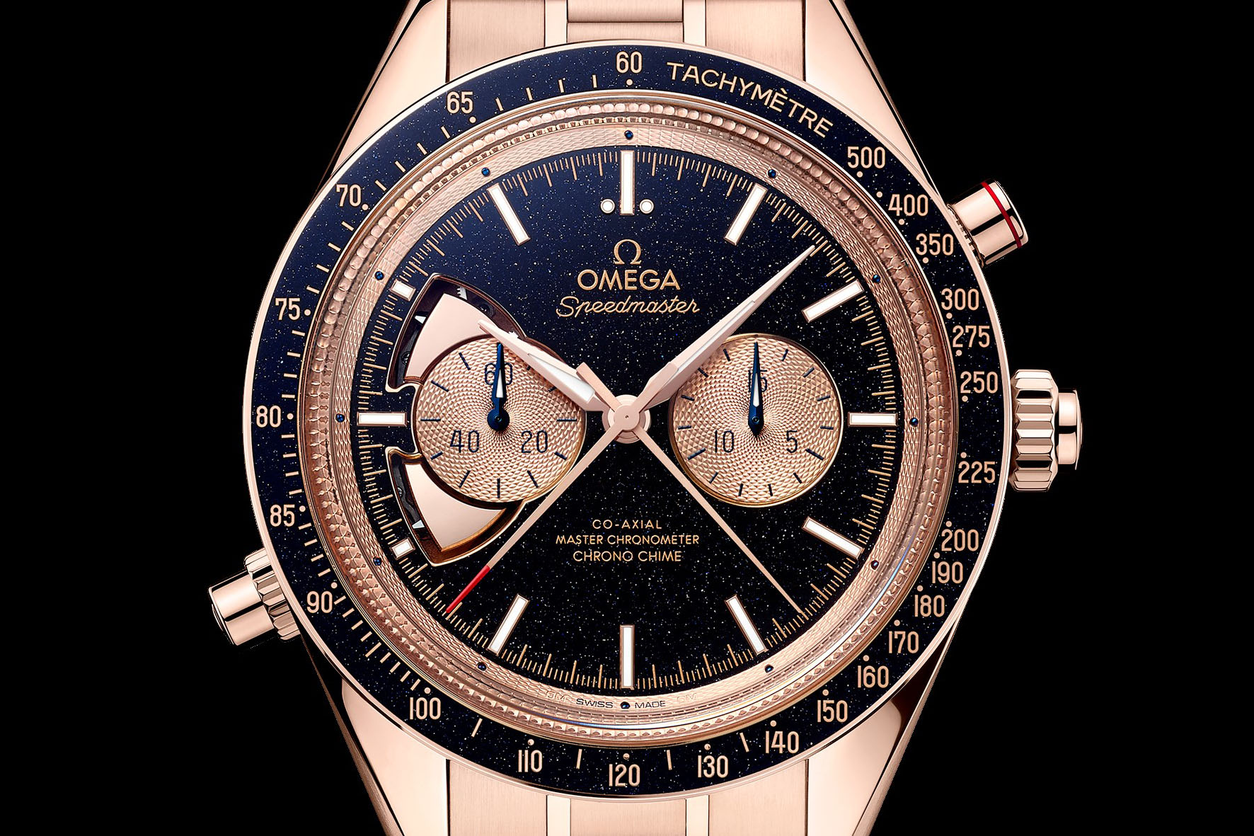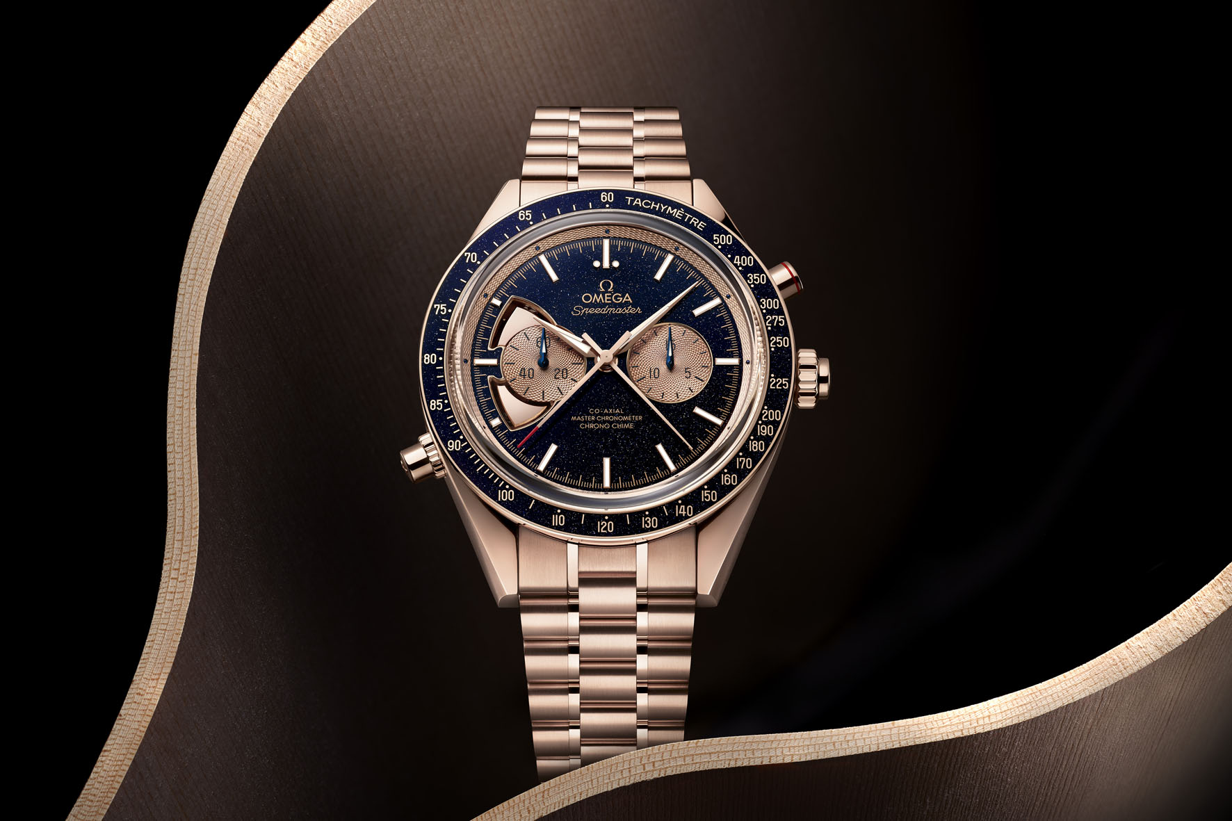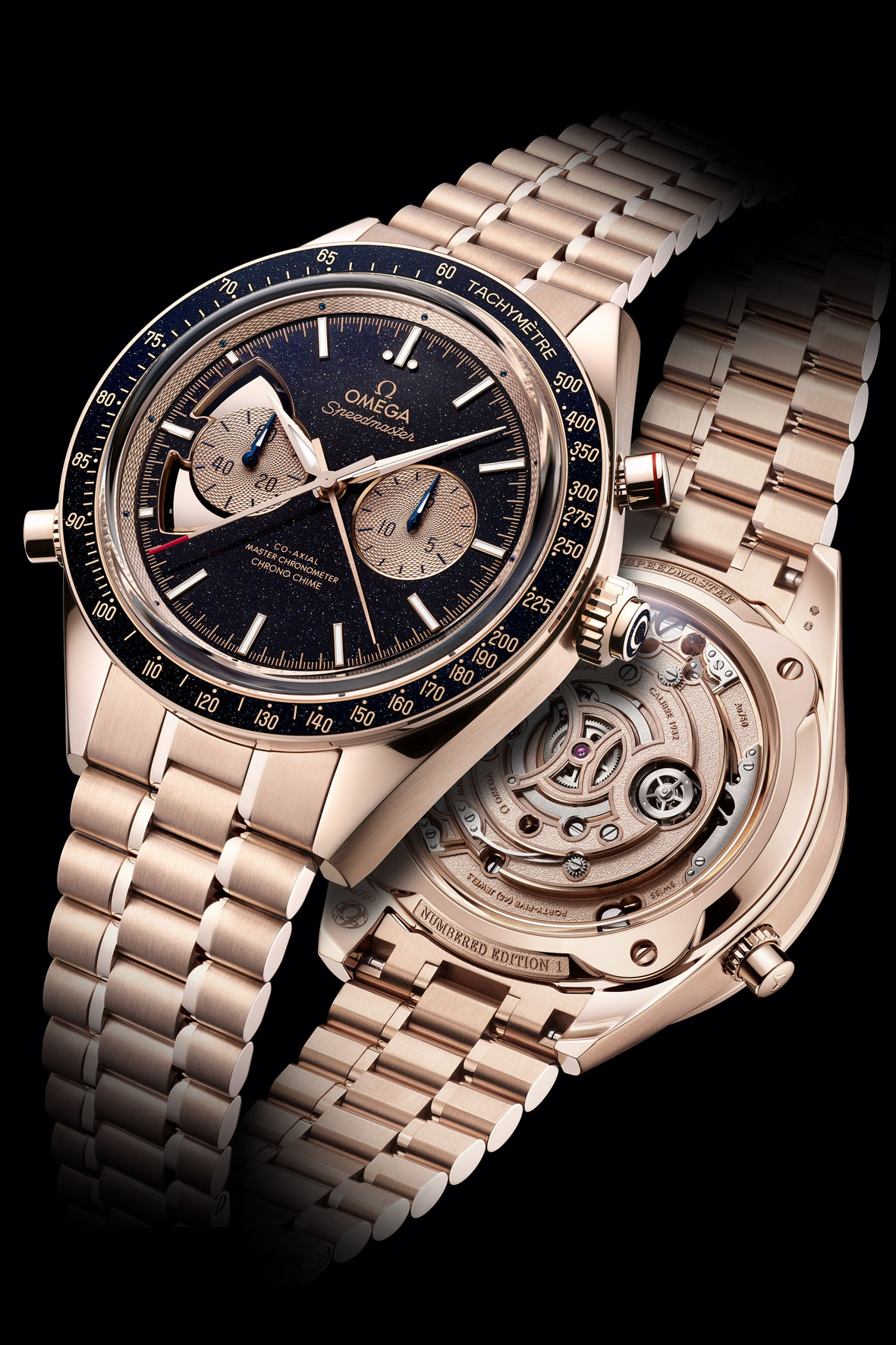 Although the movement is the same for both watches, the functional and decorative pushers are in different positions. With a chime at 8 o’clock and split seconds at 2 o’clock. For the Speedmaster, OMEGA’s ingenious watchmakers turned the calibre around to suit the configu- ration of the case and accommodate the two subdials. Completing the look is a bracelet and buckle in 18K SednaTM Gold.