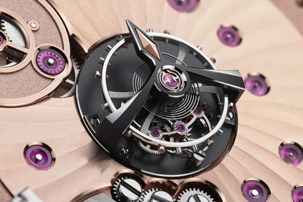 The sun-brushed dial is also in 18K Sedna™ gold, but has been given a captivating dark shade, thanks to its black PVD treatment. At the centre of the dial is the tourbillon cage with “seconds” hand polished bevels in black ceramised titanium. This ingenious device drives the movements of the mysterious hours and minute hands.