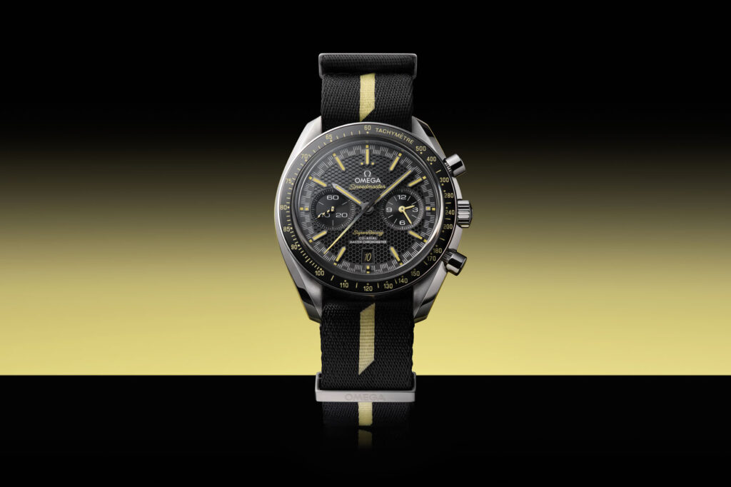 The new Speedmaster Super Racing includes a sporty alternative to the steel bracelet. A NATO strap in recycled nylon with black and yellow stripes, referencing the distinctive colour code of the Seamaster Aqua Terra >15’000 GAUSS launched exactly 10 years ago.