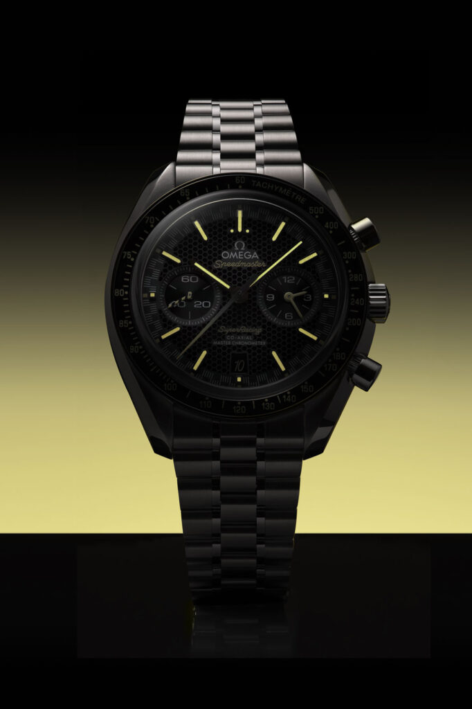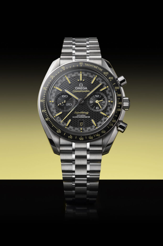 The diamond-polished and bevelled black arrowhead indexes are filled with a new and exclusive Super-LumiNova which emits a surprising yellow glow. This colour code extends to the Speedmaster and Super Racing wording on the dial.