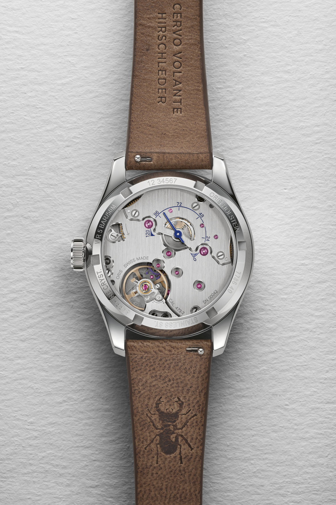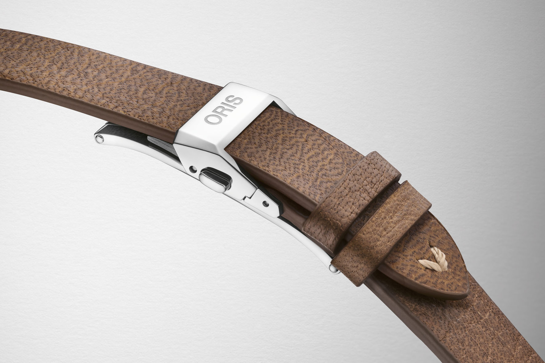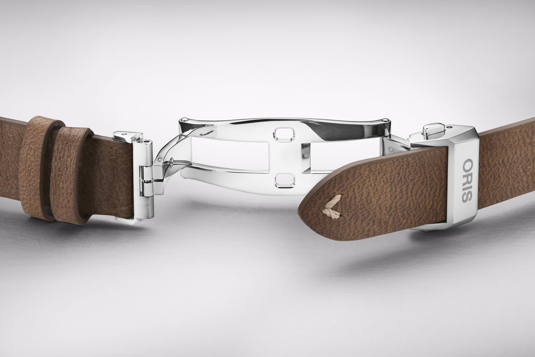 In addition to the caliber, new features of this version include a light blue dial color and a steel butterfly folding clasp equipped with a precision adjustment system paired with an olive-brown strap crafted from sustainably sourced deer leather produced by Oris’s Swiss partner Cervo Volante. (Price €4,200)