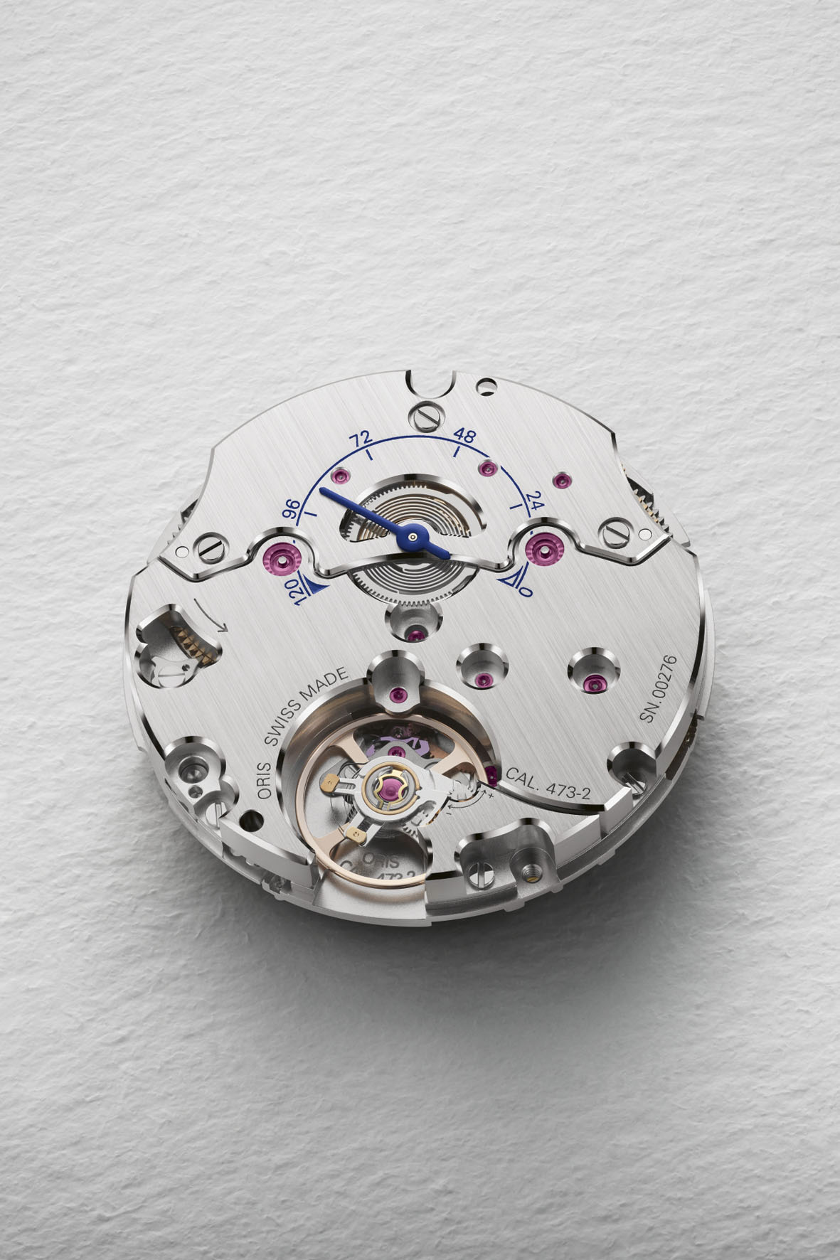 The story of Calibre 473 is that it’s built on the same base as the Oris Calibre 403 automatic. So it has hour, minute, small seconds and pointer date hands, and a five-day power reserve, now shown by a 120-hour power reserve indicator visible on the back through the sapphire crystal case back.