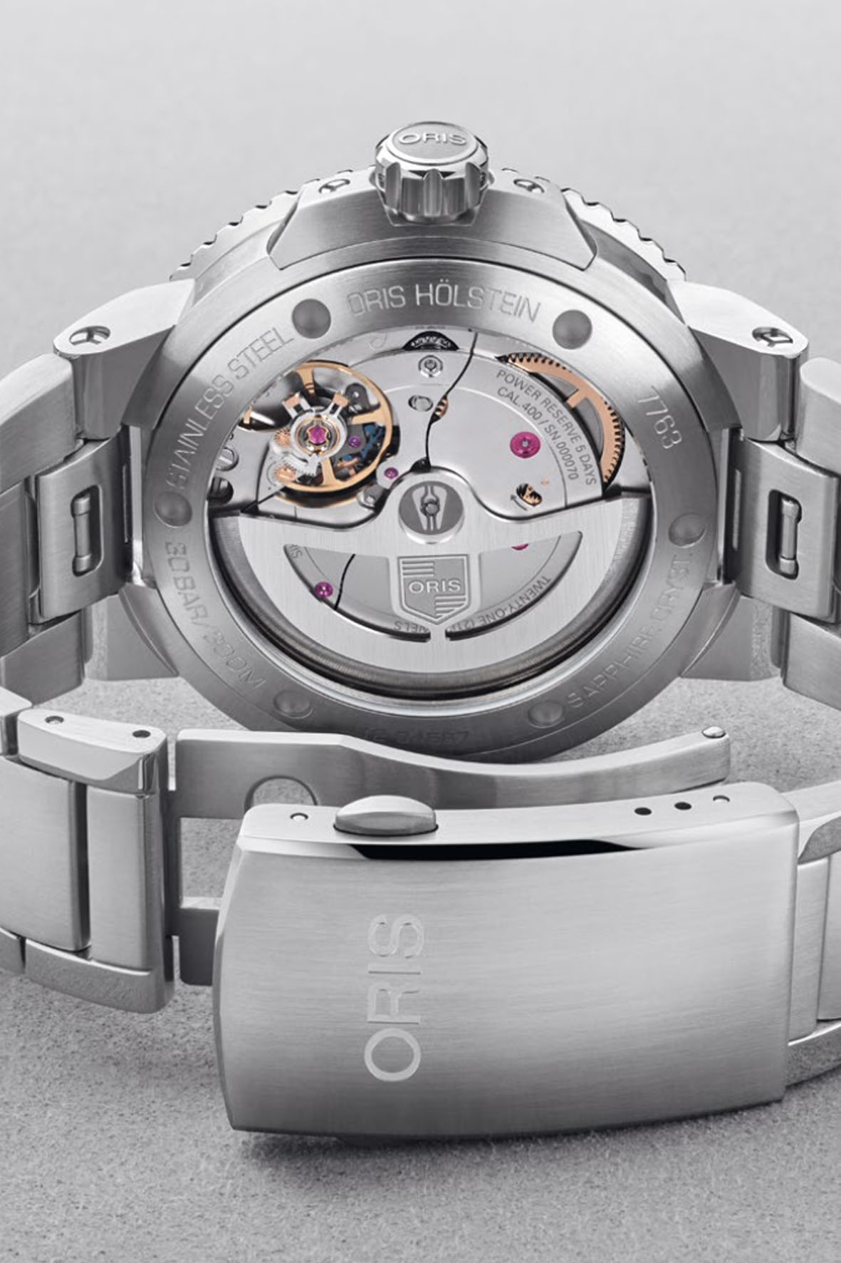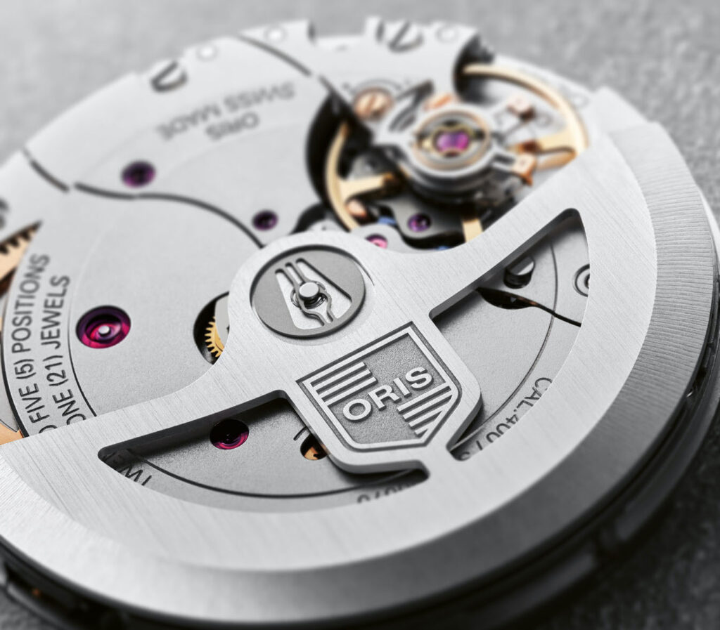 In 2020, Oris surprised enthusiasts around the world with the presentation of a new super-performance automatic manufacture movement: the Calibre 400. Chronometric accuracy (i.e. within the COSC tolerances of -3/+5 seconds per day), a power reserve of 5 days (120 hours), highly antimagnetic (thanks to the use of silicon for the escapement, anchor and escape wheel and other non-ferrous materials for the axes that hold the balance, escape wheel and anchor), with recommended maintenance intervals of every 10 years, and a 10-year warranty (by registering with MyOris).