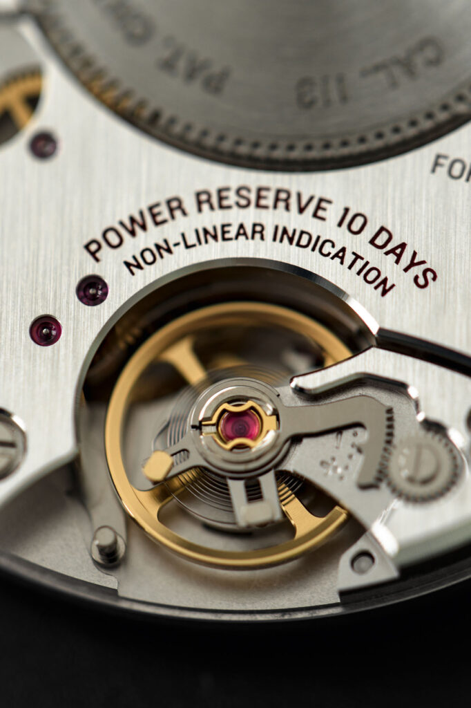 Probably the most important innovation in this calibre is the new design of the wheels in the gear train which improves the overall efficiency – to be clear, the Cal. 400 uses 85% of the energy coming from the mainspring, while the traditional calibres use about 70% – together with the rotor slide (instead of the classic ball bearing) which, by winding in one direction, reduces wear.