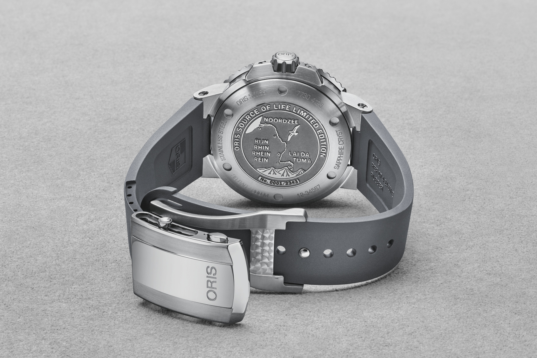 The new Oris Source of Life Limited Edition comes on either a stainless steel metal bracelet (Price €.2.200) or a grey rubber strap (Price €.2.000), both of which have stainless steel folding clasps that can be extended to be worn over a wetsuit. To reflect the height above sea level of the Lai da Tuma, 2,343 pieces will be made.