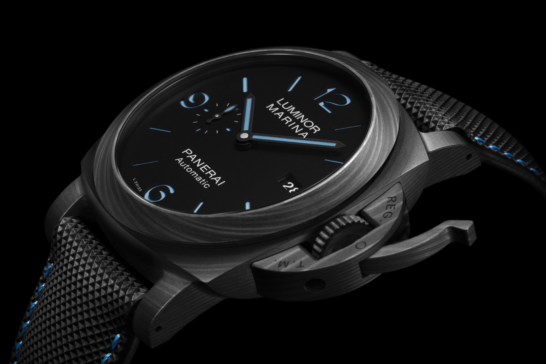 This latest Luminor Marina model overturns convention, in that for the first time the collection combines Carbotech (high-performance composite material developed by Panerai’s Laboratorio di Idee) with the iconic sandwich dial and touches of blue in Super-LumiNova.