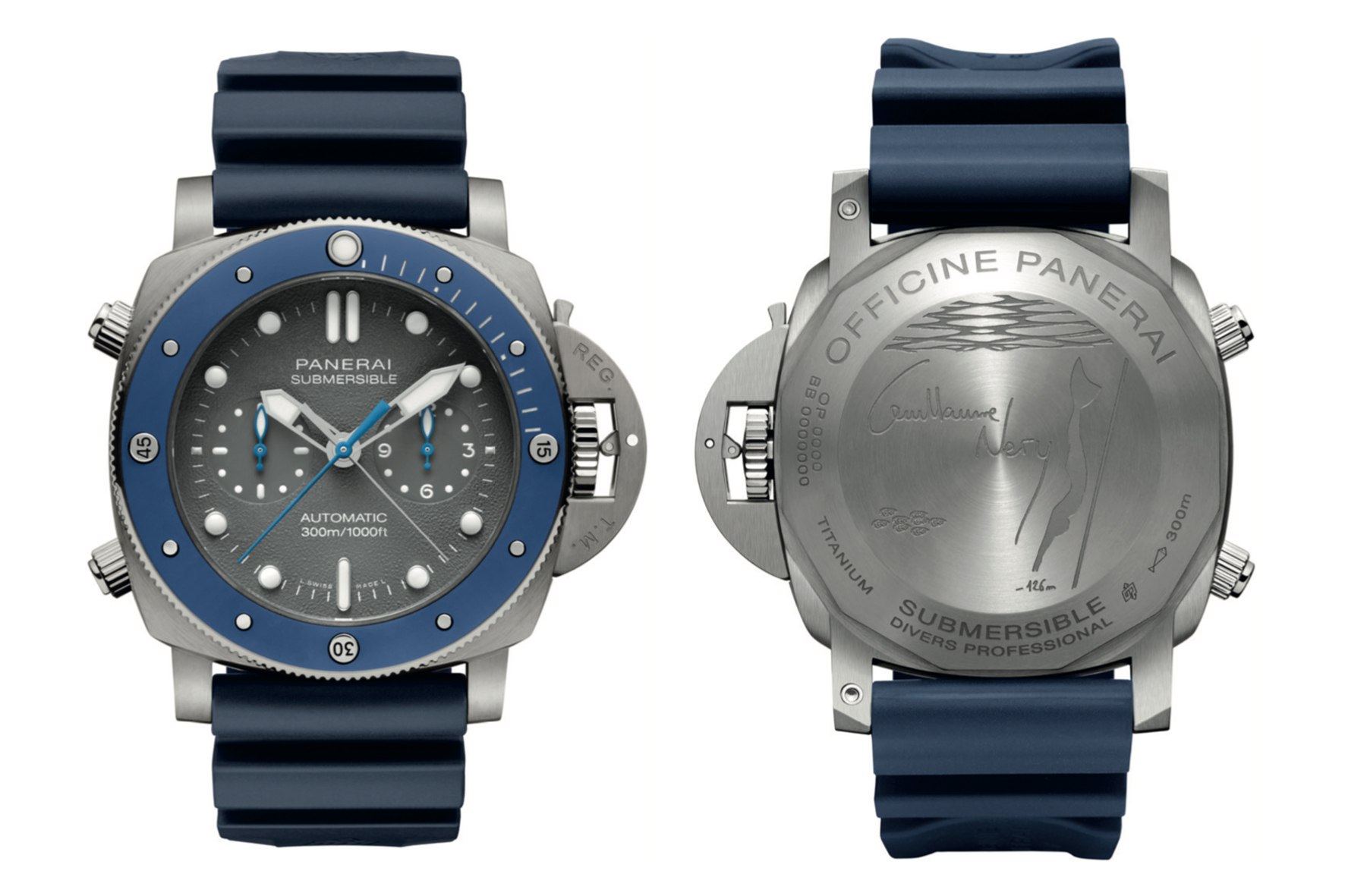 The Panerai Submersible Chrono Guillaume Néry Edition is above all a professional diving watch, water-resistant to a depth of about 300 metres and fitted with a unidirectional rotating bezel, which accurately displays the duration of the dive. The dial is clearly legible under all lighting conditions and in complete darkness, thanks to the luminous white markers, which stand out strongly against the shark grey, textured background. Engraved on the screw back are the champion’s signature and the depths of his final awe-inspiring record: 126 metres, achieved with a single breath.