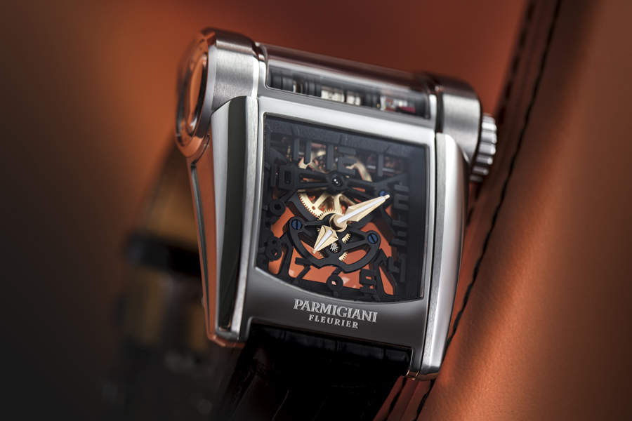 Inspired by the curves of the Bugatti Chiron, the 42,2 x 57,7 mm case is created in white gold or rose gold and engraved on the back with the inscription “Edition limitee 10 pieces” (10-piece limited edition). This case was created by Les Artisans Boîtiers – one of Parmigiani Fleurier’s manufacture divisions; constructed around the cylindrical structure and water resistant to 3 ATM, it is capable to pivot 12° around its drive shaft (patent pending), to ensure perfect ergonomics around any wrist. The technical sophistication of the timepiece can be admired via the large openings topped with sapphire crystal.