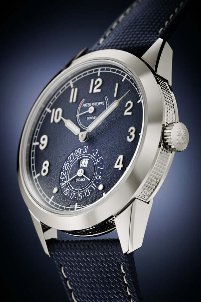 In addition to its special functions and increased autonomy, the new Calatrava 8 Days stands out by its originality as regards the displays. The power reserve indication, transfer printed along an arc (is visible on a subdial at 12 o’clock, while the day aperture, the date hand and the subsidiary seconds dial form a group at 6 o’clock. This arrangement along a vertical axis, particularly legible, also endows the watch with a unique personality. The textured dial in blue with a black gradient rim presents syringe-style applied numerals and hour and minute hands, all in white gold, emphasized by a white luminescent coating.