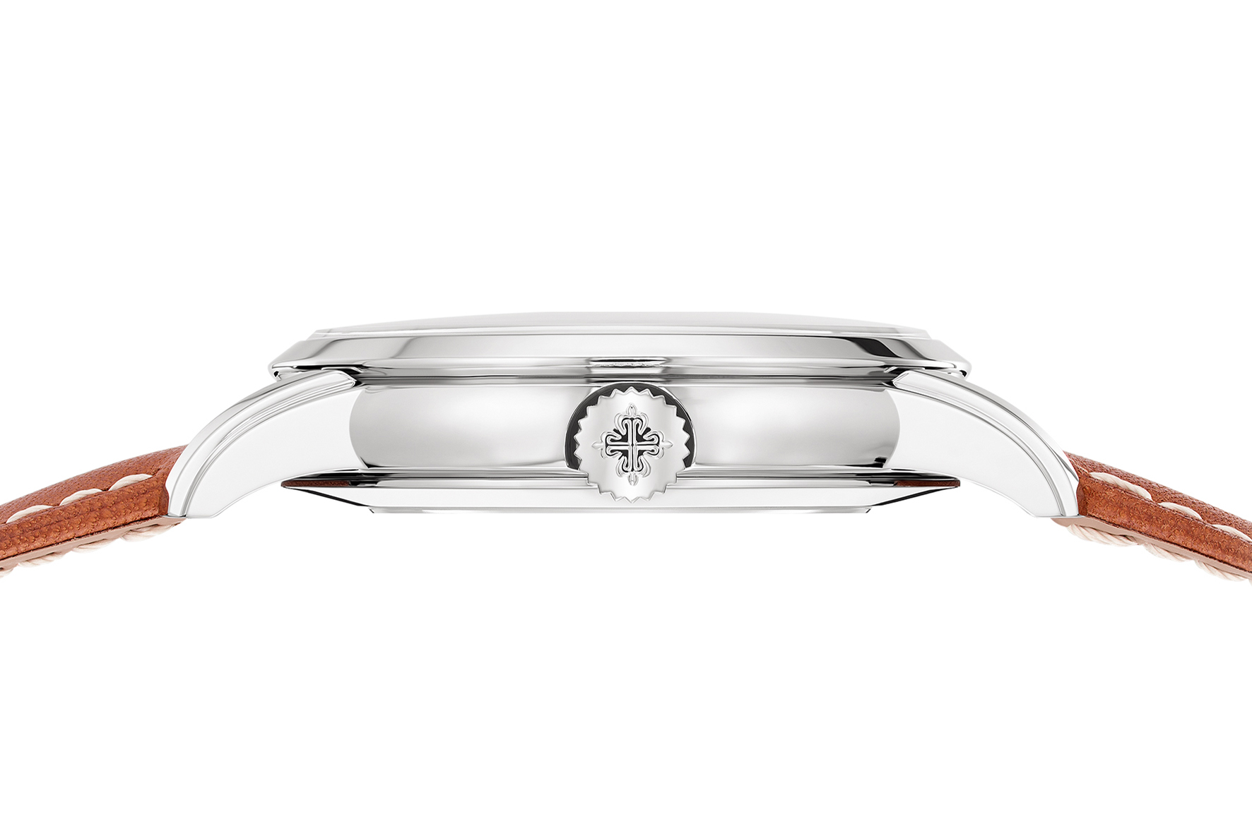 With a diameter of 40 mm and a thickness of 11.18 mm, the stainless steel Calatrava case “a rarity at Patek Philippe” also stands out on account of the finesse of the bezel that extends over the two-tiered, gently curved strap lugs. Its aesthetic appeal is inspired by the Ref. 2512, a one-of-a-kind piece made in 1955 and held in safekeeping by the Patek Philippe Museum. This kinship is emphasized by the reference number of the new Calatrava Weekly Calendar that consists of the same numerals in a different order. The vintage aspect is amplified by a box-type sapphire-crystal glass with a slightly cambered profile. The stainless steel snap back has a sapphire-crystal inset.