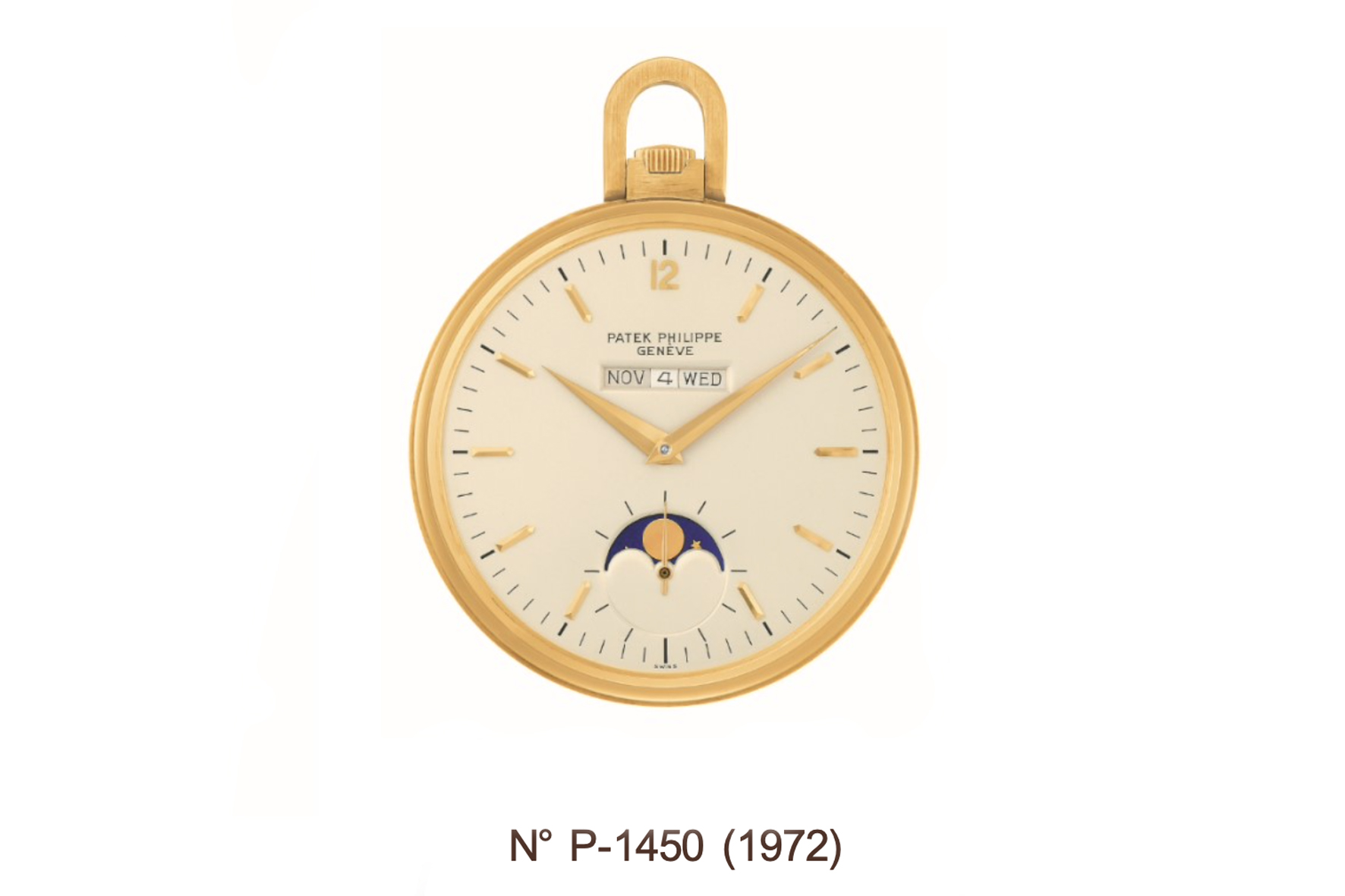 In the course of time, the manufacture had already crafted pocket watches with an in-line calendar display for the American market. Customers in the new world were enthusiastic about complicated watches that were easy to operate and showed the indications of the perpetual calendar at a glance. One example of such timepieces is on display at the Patek Philippe Museum: it is a pocket watch from 1972 (No. P- 1450) that features a calendar format “à l’américaine” (month, date, day).