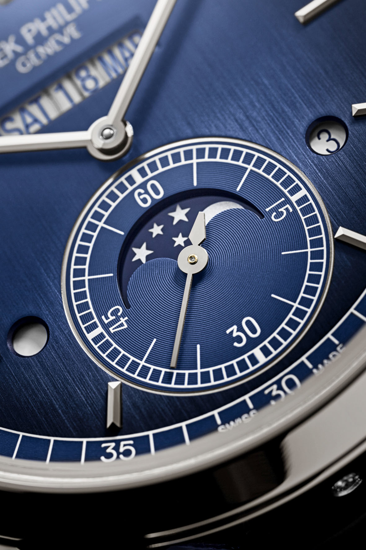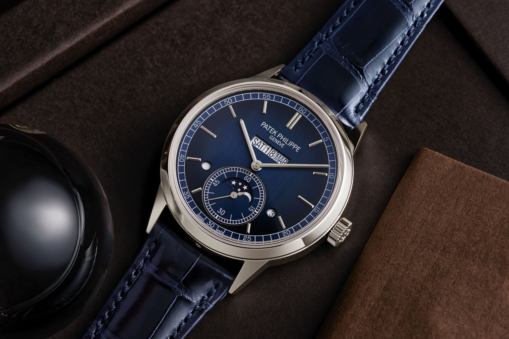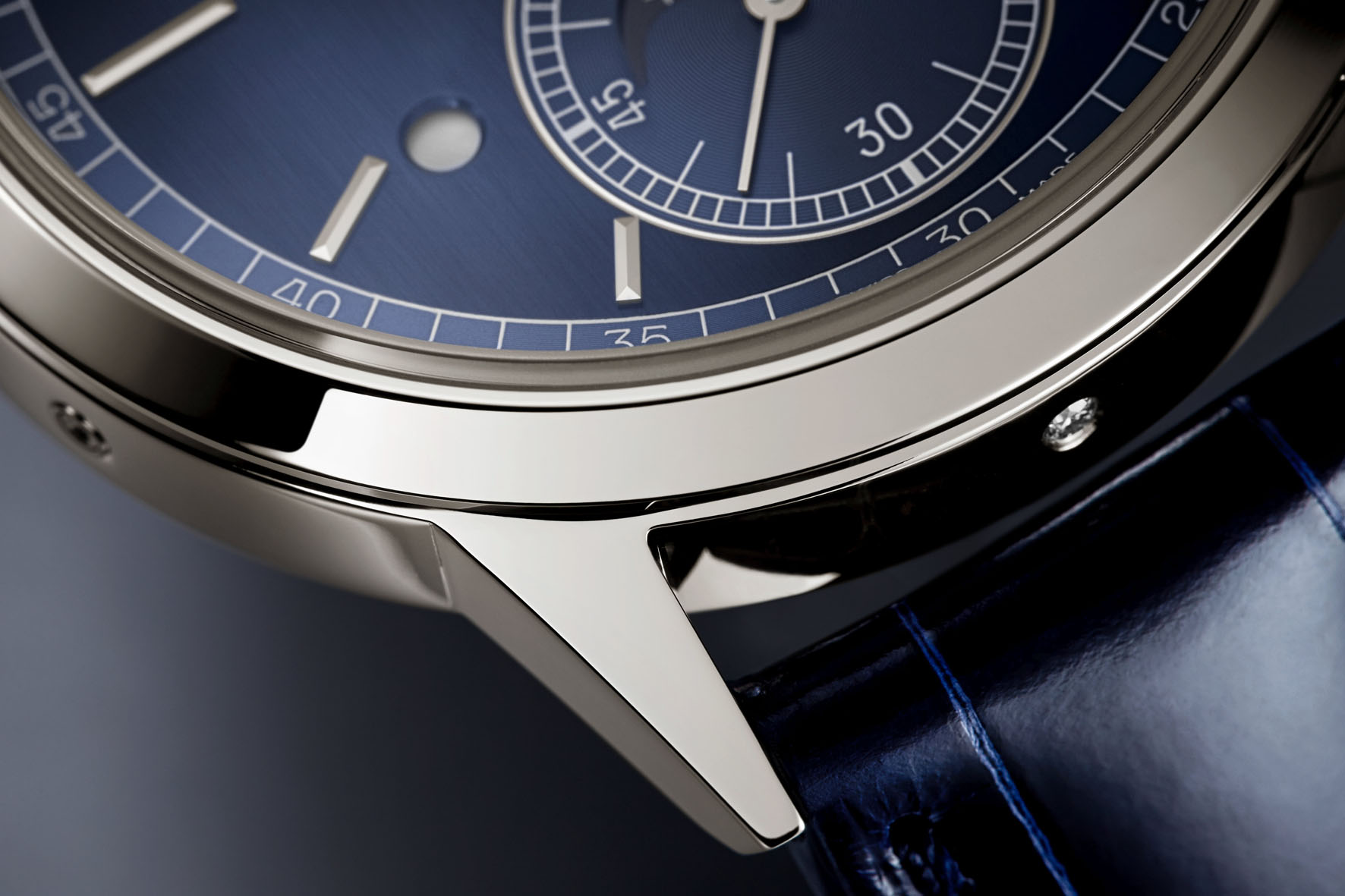 As in most of Patek Philippe’s platinum wristwatches, the case flank features a small diamond at 6 o’clock.